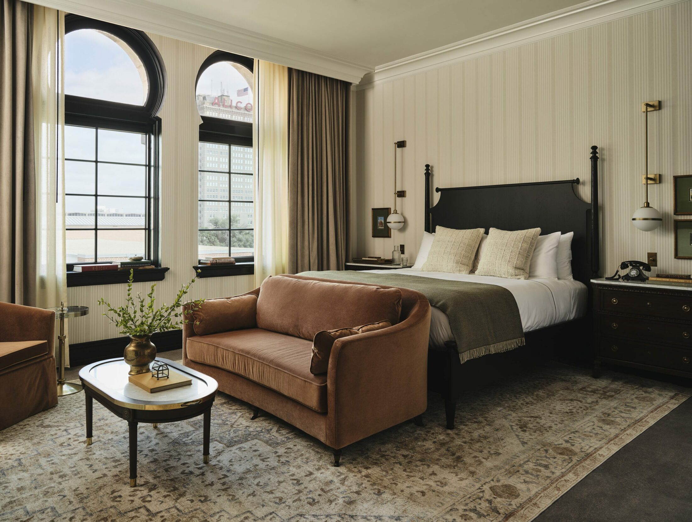 The 33 guest rooms offer a blend of historic charm and luxury, with custom linens and Turkish-made robes. Dining options include The Brasserie, serving Southern-inspired cuisine, and Bertie’s on the Rooftop, offering seasonal dishes with panoramic city views.