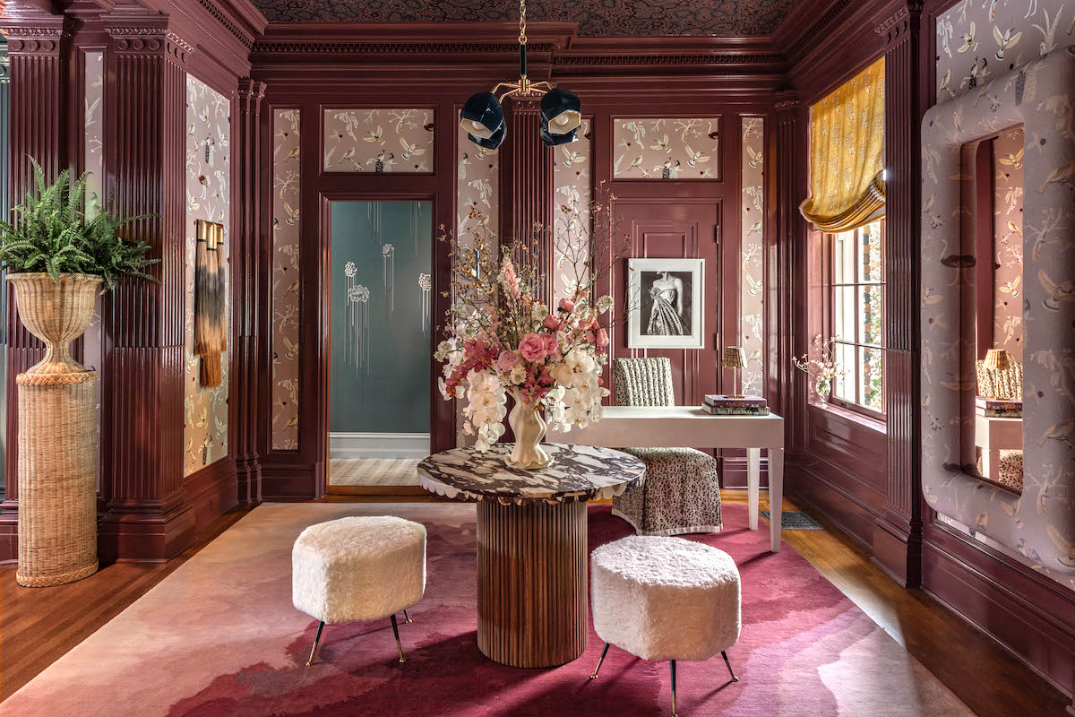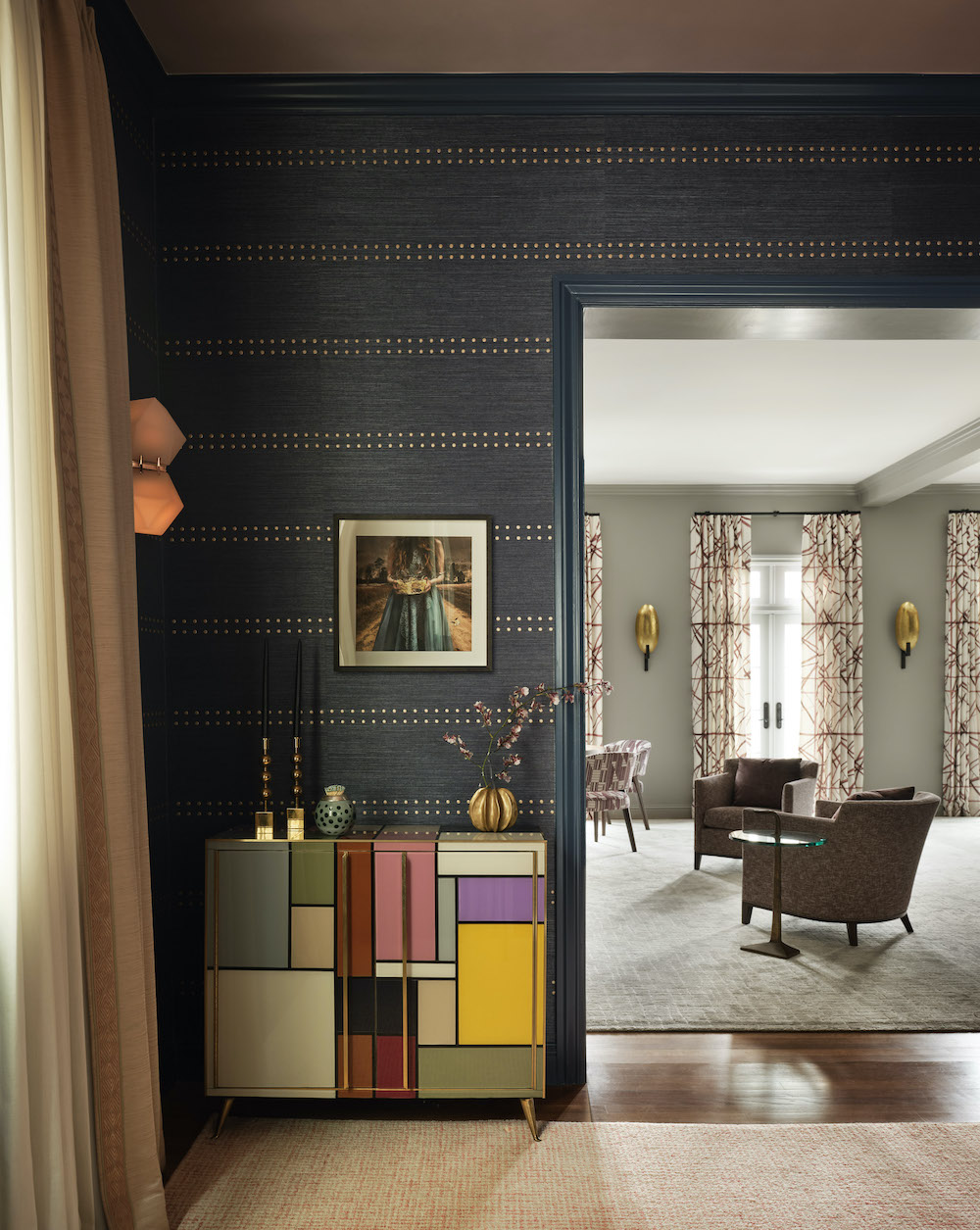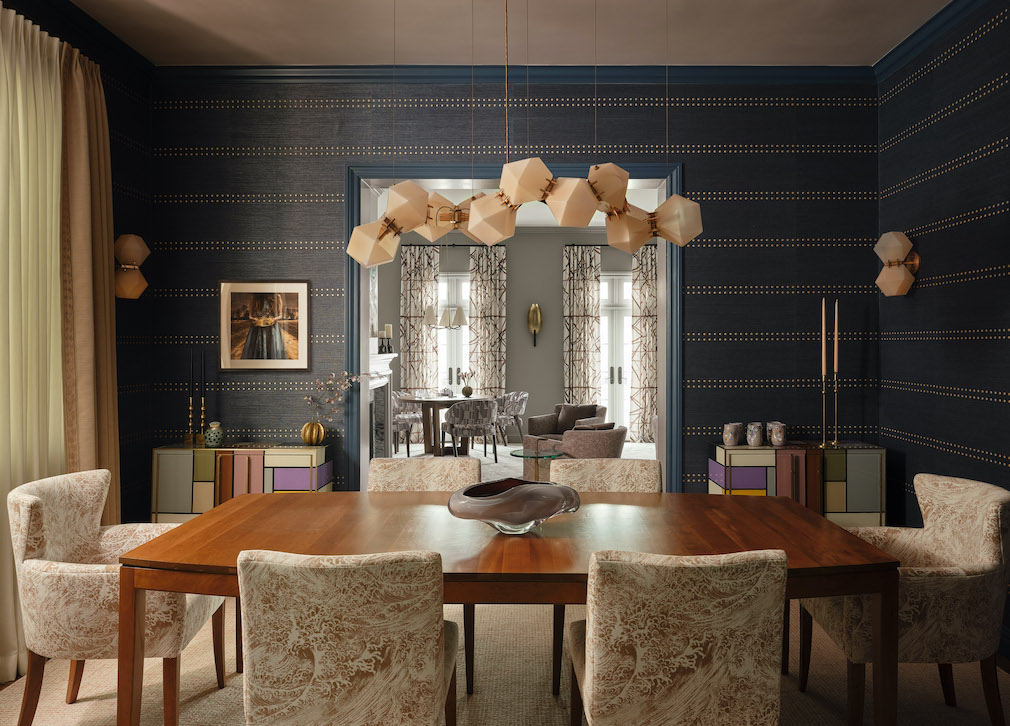 The dining room pairs traditional architecture with contemporary detailing. A custom Philip Jeffries wallcovering with rose-gold rivets wraps the room, while the homeowners’ refinished Stickley table anchors the space. Reupholstered dining chairs introduce soft color, and a metallic pink ceiling finish subtly reflects light across the moldings, transforming what was once a dark room into a focal gathering space.
