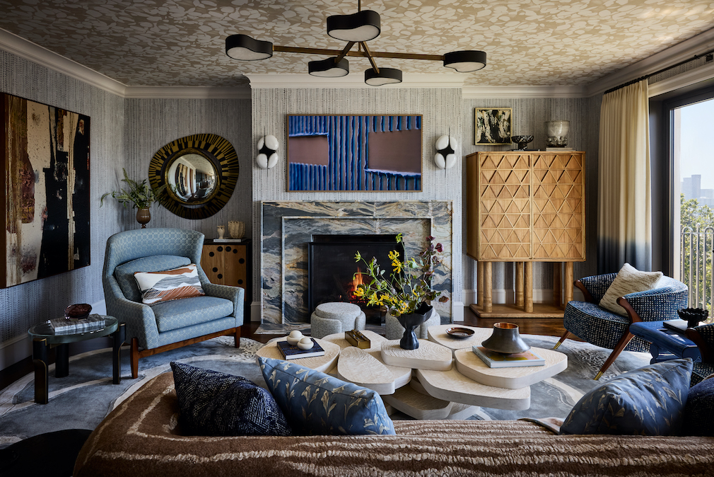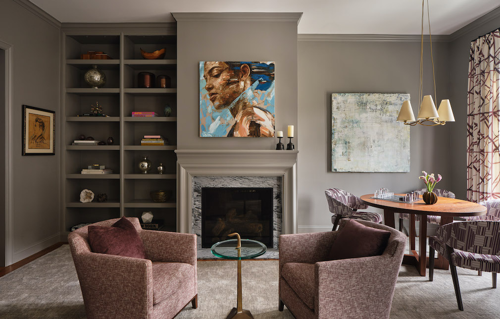 With the architecture clarified, MacDonald layered furnishings to encourage everyday use. In the living room, seating arrangements create multiple zones: a conversational grouping near the restored fireplace, a quieter corner for reading and a game table positioned to capture the southern light from three French doors. Custom rugs define the L-shaped room while keeping the original wood floors visible. Decorative lighting — Herve Van Der Straeten sconces from Ralph Pucci, a vintage pendant, Jonathan Browning Studio table lamps and upgraded architectural lighting — adds warmth to the historic envelope while highlighting artwork and built-ins.