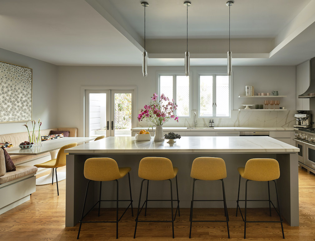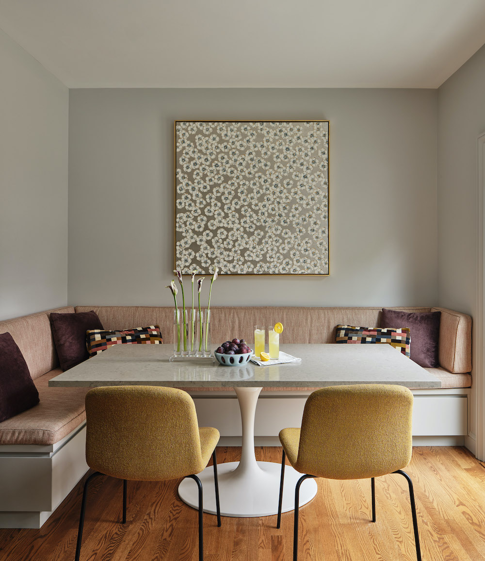 Because the homeowners cook frequently, the kitchen became central to the renovation. Cabinetry was designed around carefully programmed storage, with banks of drawers replacing upper cabinets along one wall. Quartz countertops were selected for durability — allowing enthusiastic cooking without worry — while a coordinating stone slab tops a custom table in the room’s breakfast area. Rather than delicate finishes, MacDonald emphasized practicality, explaining that the family wanted spaces that were “durable but beautiful.”