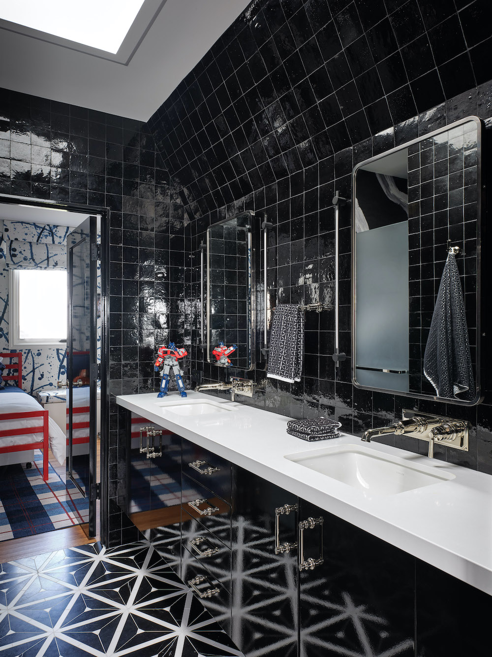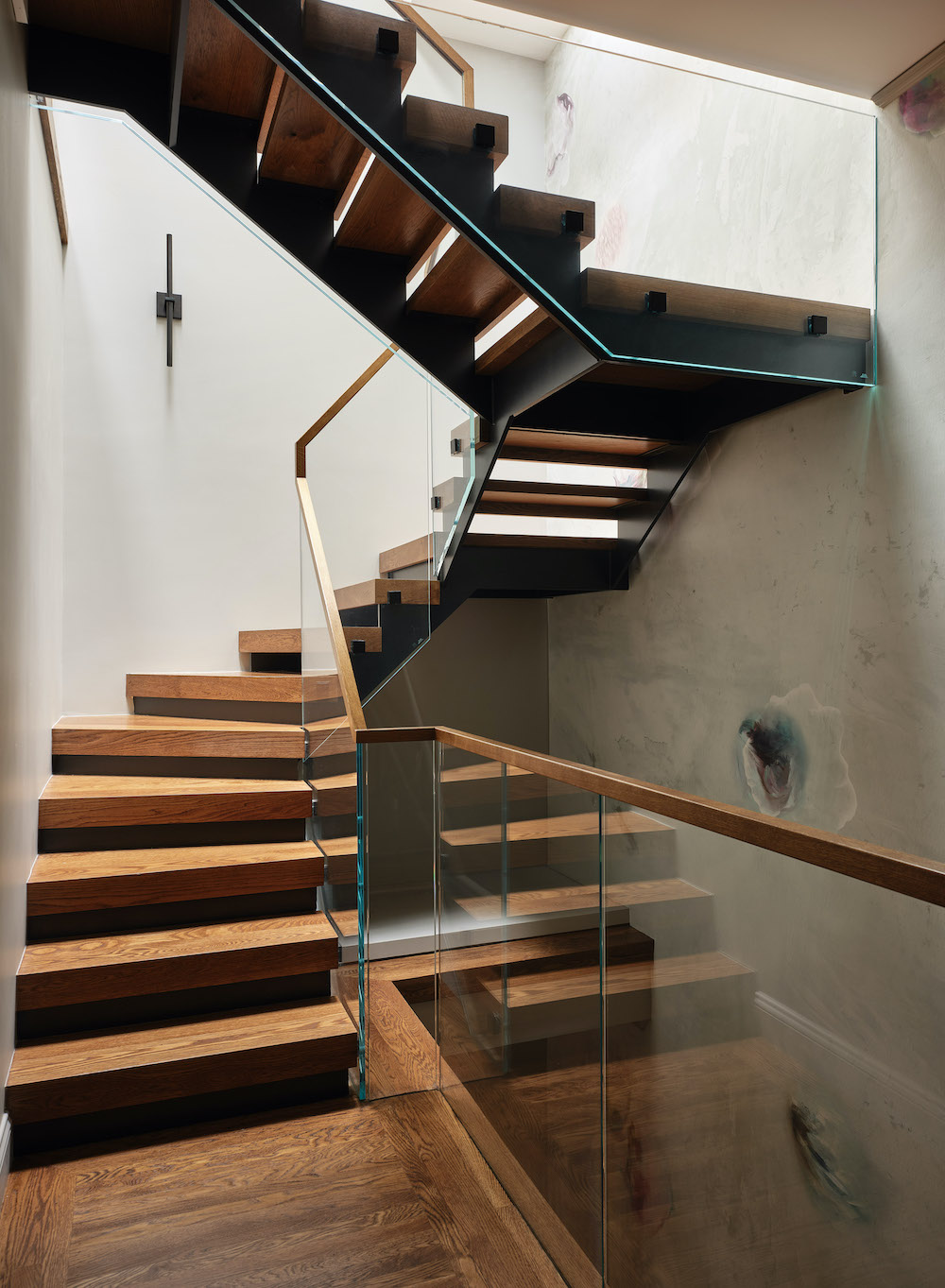 A few years after the first phase — just as planned — the team returned to complete the second stage. The unfinished attic beneath the mansard roof became bedrooms and a shared bath for the couple’s sons. A sculptural stair with a glass railing brings daylight from a skylight down into the house. “The staircase was designed to pull as much light down into the house as possible,” Ulinskas explains.
