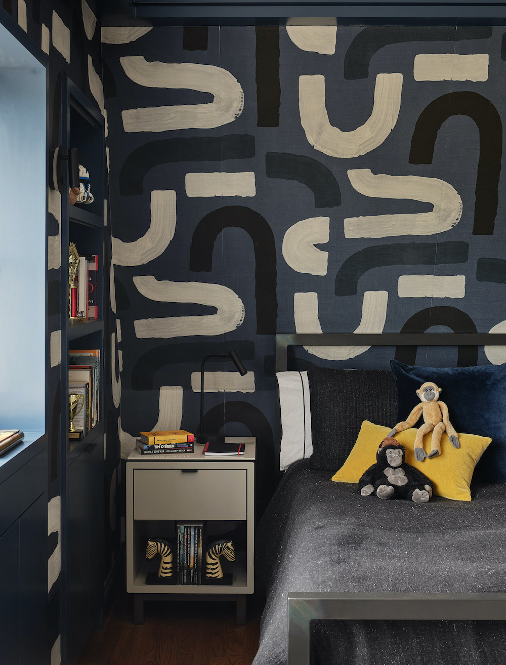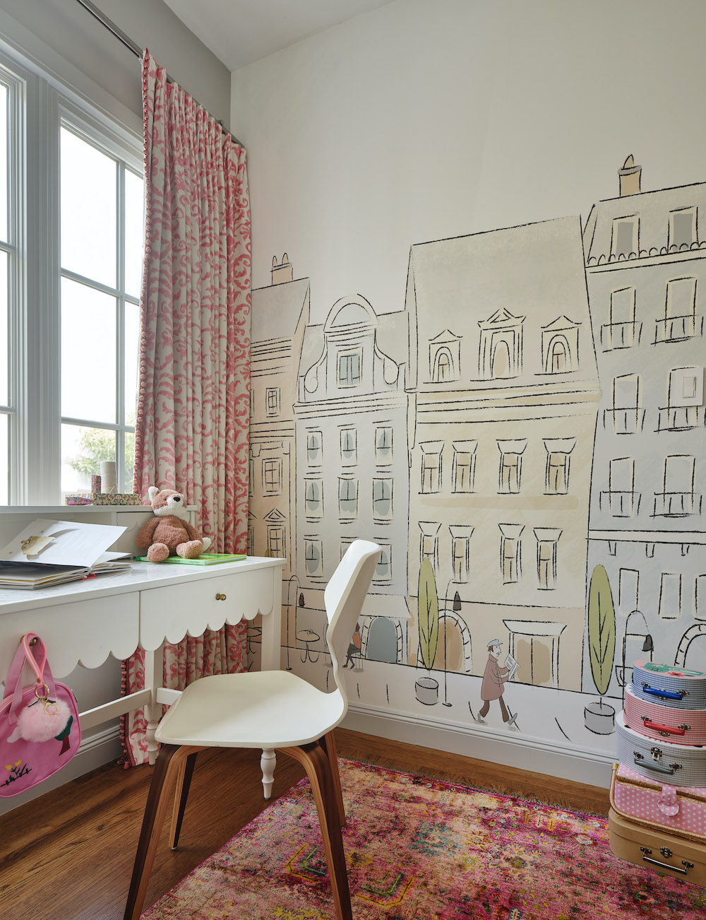 Upstairs, private rooms follow the same philosophy. The primary suite retains its original moldings but softens them with monochromatic paint finishes in varying sheens. A large-scale Phillip Jeffries mural behind the bed adds visual interest without clutter, while the daughter’s bedroom introduces playful Anewall wallpaper depicting a Parisian street scene.