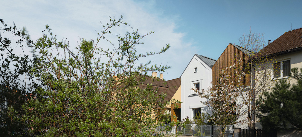 From the Architects | A single row of old semi-detached family houses remained surrounded by concrete blocks of flats, creating an exceptional private island of gardens inside a high-rise residential area of the Pilsen–Lochotín district. Most of those houses had already been renovated and enlarged by later additions, changing the original scale of this neighborhood.