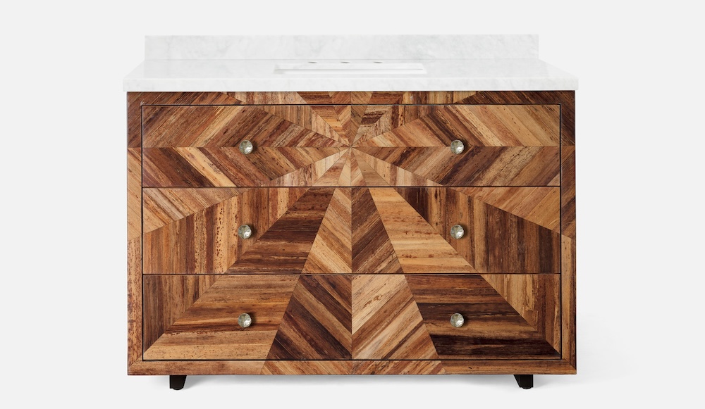 Hand-lain panels of banana bark create a naturally striking finish on this vanity, with a concentric starburst pattern evoking eclectic artistry. Each drawer comes with a lily pad-like knob and an assortment of countertop materials to choose from–like chic pewter burl resin. Split leaf hardware provides the finishing touch.