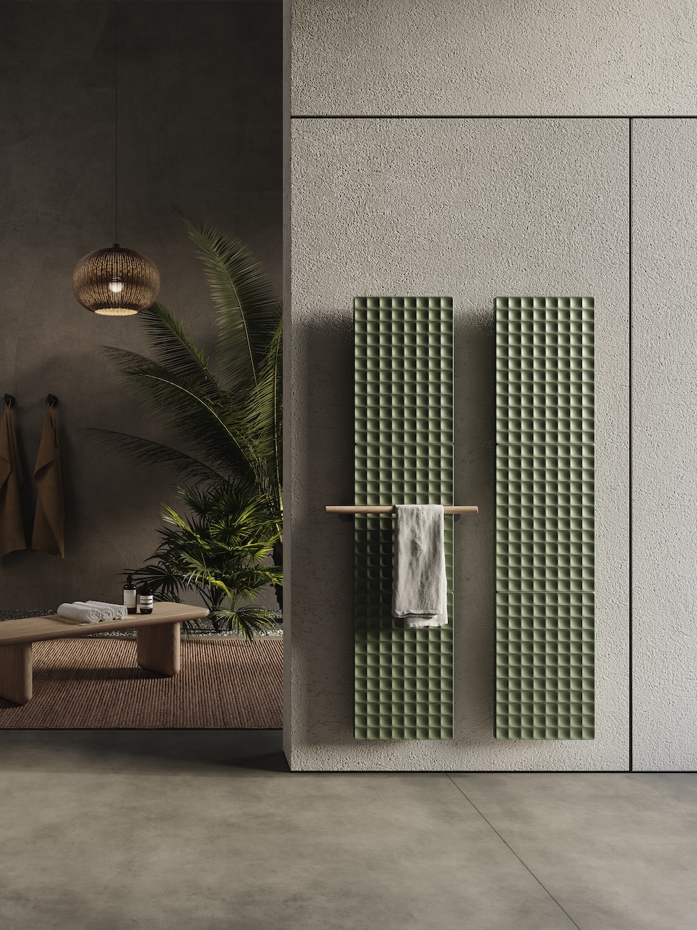 Waffle, the radiator designed by Piero Lissoni, is now available in an electric version. Waffle can be installed horizontally or vertically, and accessorized with a practical handle in ash or walnut or a hook in the same wood essences, for easy insertion into the bathroom environment.