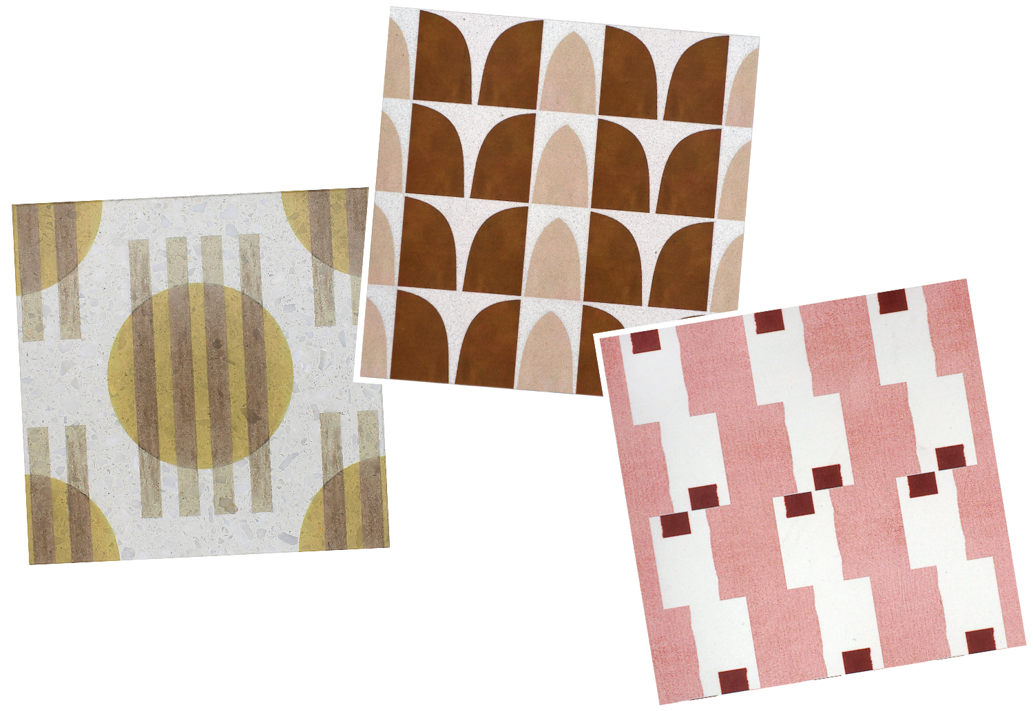 (Pictured left to right) Modern Solstice Collection, Sunshades in Sahara terrazzo tile. Marigold Collection, Petals in Rose Gold, Polar Ice terrazzo tile. Rematch Collection, Chutes + Ladders in Cherry Bomb porcelain tile.