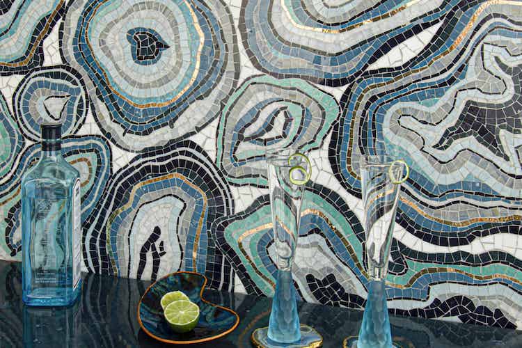 The 15 mosaic designs in the Biome collection are handcrafted in Virginia from stone and Glazed BasaltoTM with accents of shell and iridescent and metallic glazes. Shown here in honed Thassos, polished Indigo, Orchid, Cornflower, Hydrangea, Aloe, Lotus, Periwinkle, Celeste, Carrara, Blue Macauba, and Aurum.