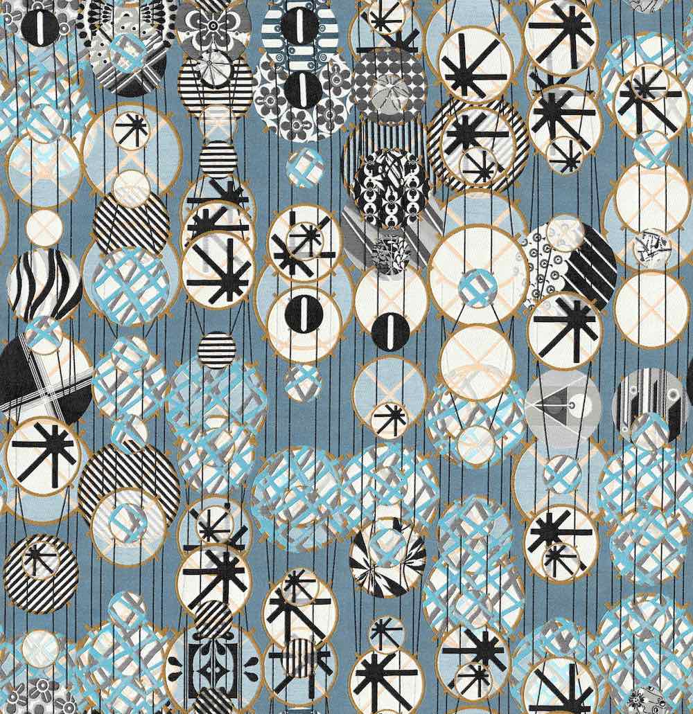 Jacob Hashimoto who has designed two intricately woven upholsteries that interpret the painterly layering of Hashimoto’s sculptures of hundreds—sometimes thousands—of handmade bamboo kites. Beyond (pictured above) references kites hung in rhythmic arrangements for animated impact, while Midair references the expansiveness of Hashimoto’s sculptures where handmade kites are suspended from one another in compact clusters.