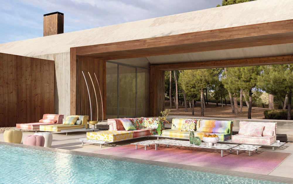 This season’s debuts from Roche Bobois highlight the brand’s unwavering commitment to exemplifying the French Art de Vivre. Pictured here, the Mah Jong sofa designed by Hans Hopfer – one of the brand’s iconic models – is revisited with an outdoor version in a new collection of Jean Paul Gaultier fabrics with patterns as delicate as they are exuberant, and new Missoni fabrics awash with the fashion house’s signature zigzags in vibrant yet delicate colors.