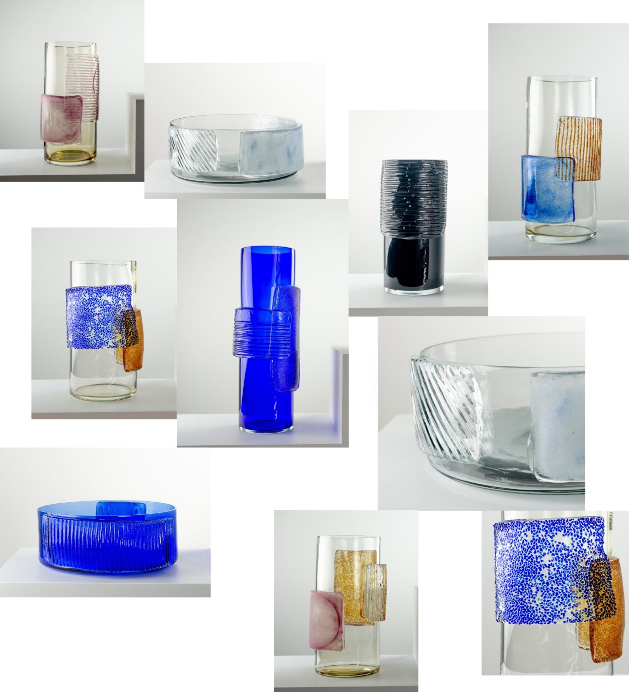Designed by Dan Yeffet, the Patchwork collection is a fusion of pure mold-blown Murano glass vessels with textured geometric glass sheets. Veronese and Yeffet embraced the challenge of melding patches of molten glass with the base, leaving some aspects to chance.
