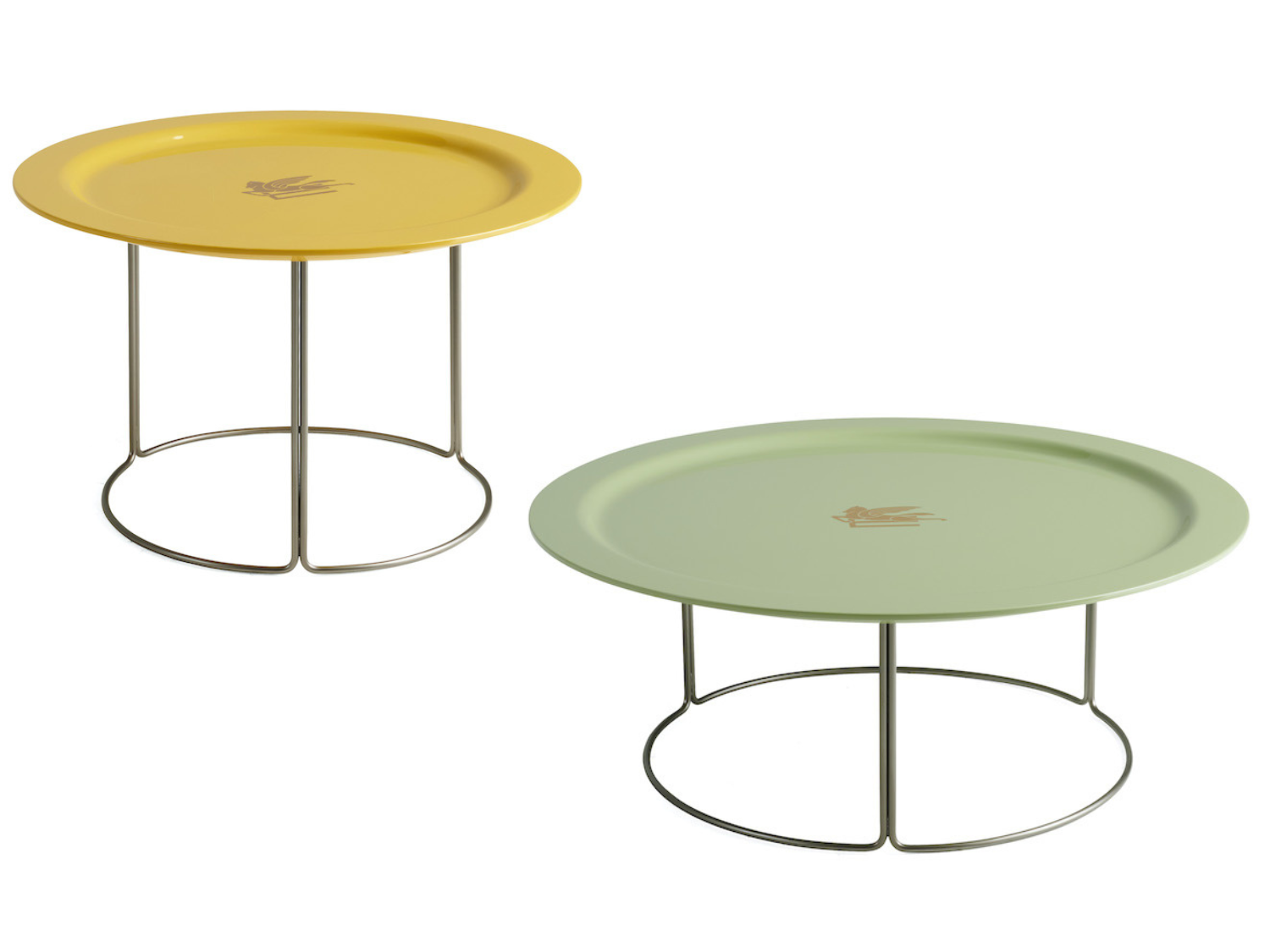 Available in different sizes and heights, these tables by designer Marco De Vincenzo allow the creation of functional and scenographic combinations in the living area. The minimalist structure is made up of curved metal pipes with a bronzed finish.