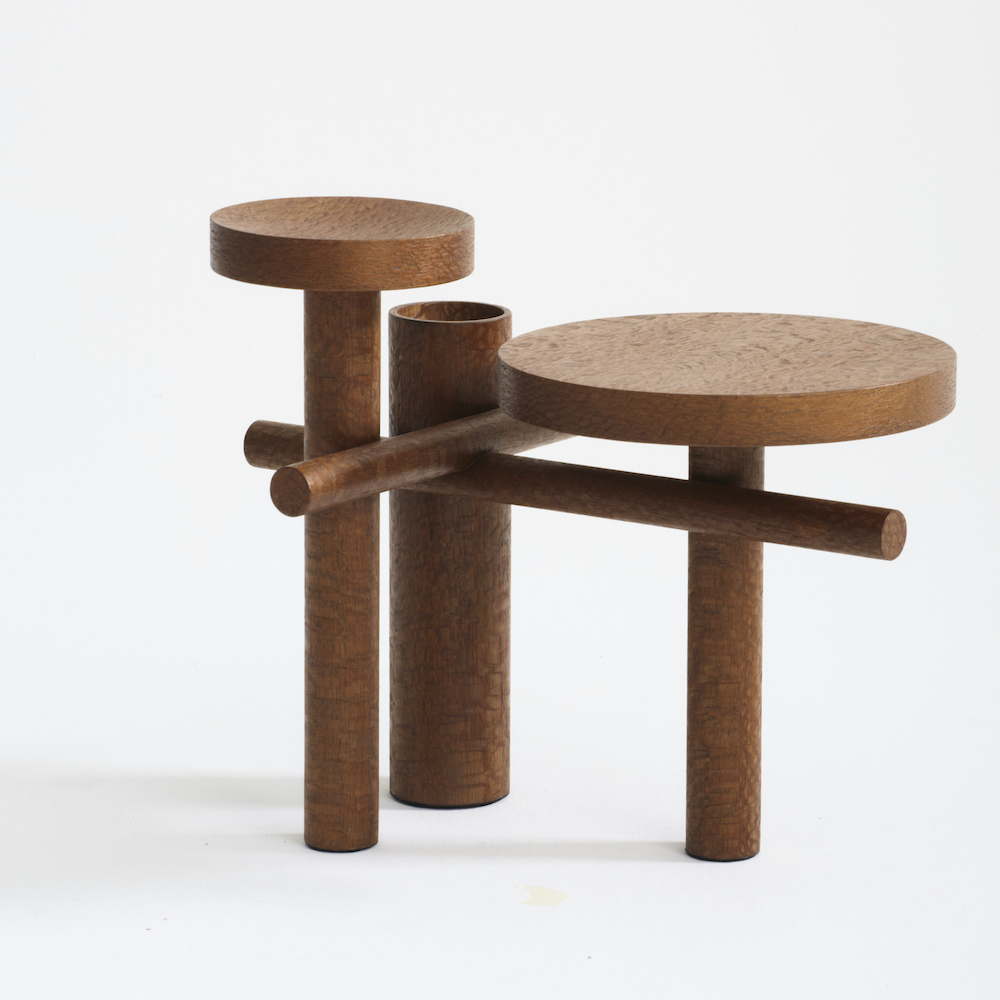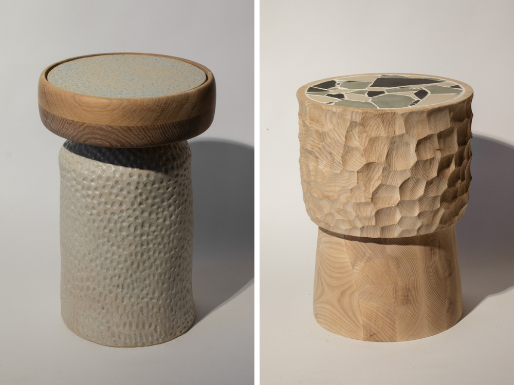 Streicher Goods and Ian Love join creative forces to bring to life several unique furniture pieces, combining hand-carved wood with hand-built ceramics. Collection I embodies a raw yet refined aesthetic, with sculpted architectural and organic forms, celebrating the beauty of natural materials and traditional techniques. Pictured here: Sidetable II and Sidetable III.