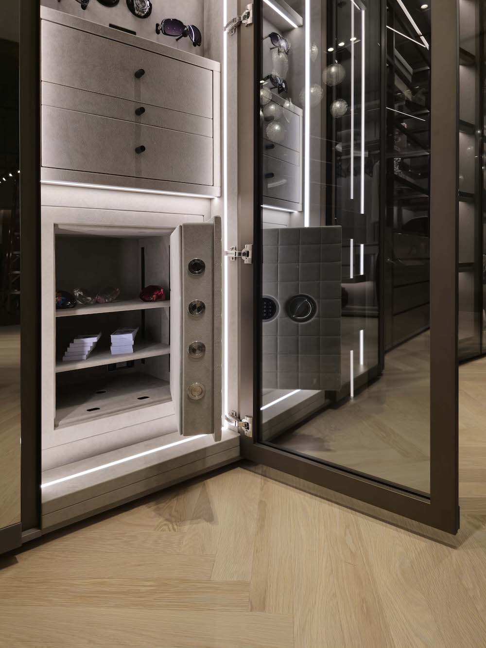What gives these pedigreed wardrobes the eggersmann USA touch is their ability to conceal gear and gadgetry in plain sight. For example, a hidden safe may be concealed behind shelving or a mirror, while a watch winder can be built directly into a drawer or panel. Their integrated lighting is both practical and pretty — providing a lit-from-within glow to every closet configuration, even inside drawers.