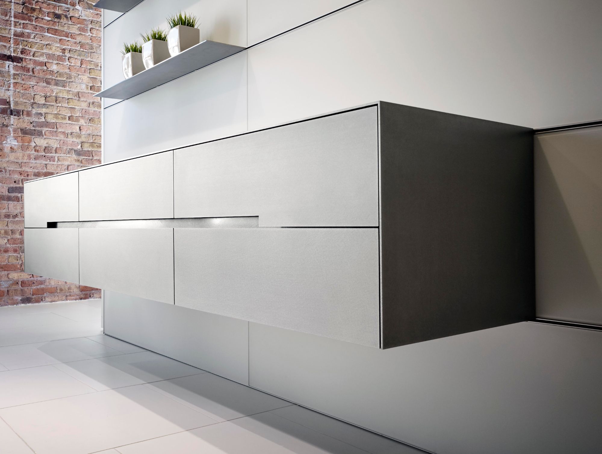 It’s that soft, non-linear edge that makes eggersmann’s Silver Touch pair particularly well with soft woods, stone, and other metals such as blackened steel or brass. The Silver Touch finish is currently available in a five-millimeter-thick worktop and three-millimeter-thick cabinet fronts. And you don’t have to restrict stainless steel to the confines of your kitchen. From an elevated credenza as a dining room buffet or upscale office file storage to upgrading your home’s media storage solutions and other cabinetry, one thing’s for sure: Silver Touch is poised to give your space a new and improved Midas touch.