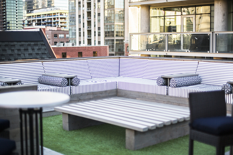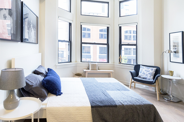 Fritz was inspired by the musical origins of the Bush Temple, so much so that she incorporated a few telling details in the design. “A building’s history is always my starting point when designing the space,” she said. “There are many homages to its former use as a piano showroom. Three upright pianos grace the lobby, a Bush and Gerts model of course, plus one found at a former project, and one that is in use for entertaining residents and the community on the small lobby stage. Sheet music from the turn of the century adorns the walls of this stage and can be found in a few other areas of the building. Several early 1900’s piano stools were used throughout the lobby as seats and side tables.”