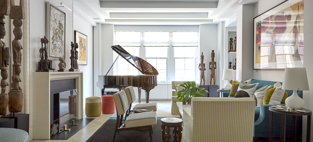 Commissioned to revitalize a prewar Manhattan apartment for a couple enthralled by African art, architect Enda Donagher took inspiration from Robert Adam and John Russell Pope to create restrained, classically articulated interiors that are both a fitting frame for the homeowners’ collection and a relaxed environment for daily life. Aside from the plaster colonnettes that define the wall bays and openings between primary rooms, architectural detail is kept to a minimum. The wide-plank floors are white oak with a custom blond finish that was developed on site and set in a chevron pattern.