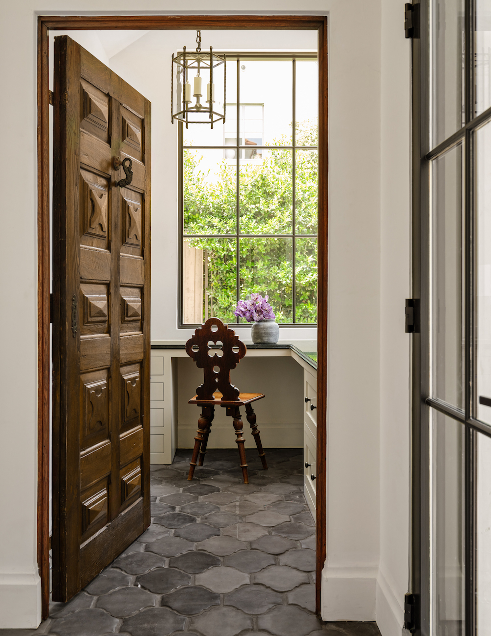 For areas like the living room and kitchen, an amalgamation of furnishings and finishes blur the line between architecture and design. However, in the home’s more private spaces, carefully curated statement pieces provide an atmospheric charm. Sander is particularly fond of the Catalonian door – sourced from Spain, of course – that leads into the client’s office. “She wanted the door itself as a piece of art,” the designer shares.