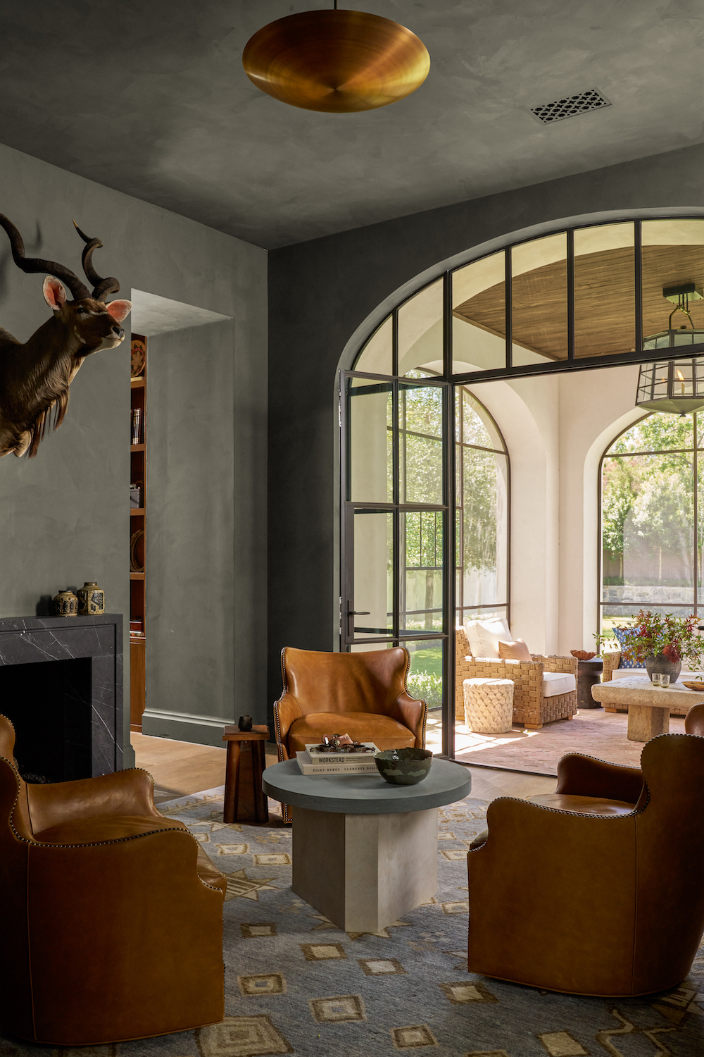 With raked plaster surfaces, fascia details and exaggerated arched windows, the newly built residence from Mark Hoesterey of SHM Architects epitomizes Spanish Revival style. However, it was the architecture’s “very true Spanish details” that gave Sander some autonomy on the décor. “It gave us the ability to create younger, more unique interiors,” she describes. “We brought vintage pieces in and added a little bit of edge, so it felt fresh and new for the next generation of their family.”
