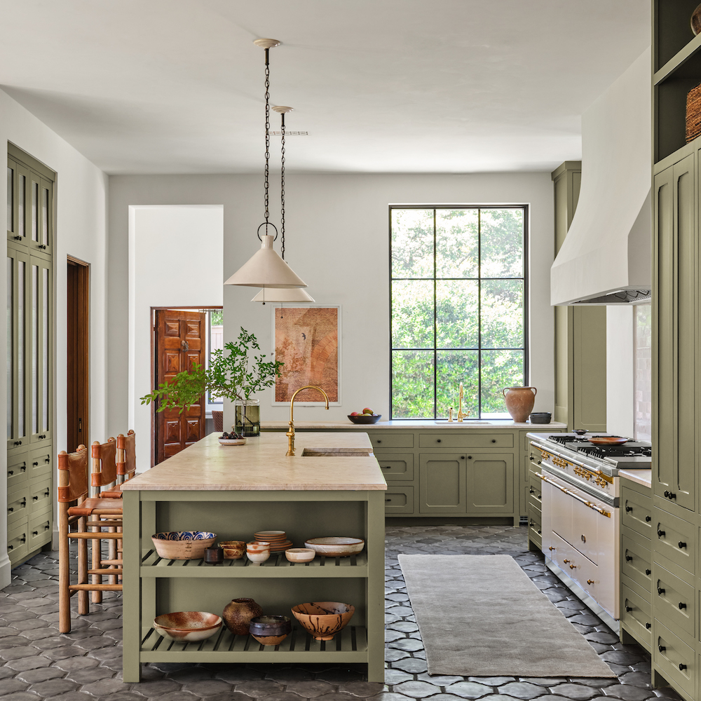 Meanwhile, the kitchen possesses a crafted tactility with handmade concrete underfoot, an assortment of artisanal pottery and a backsplash composed of Daniel Heath’s handmade and hand-painted tiles. The cabinetry is coated in a muted green, one of Sander’s signature colors, to tie the hand- wrought details together. “We love to use it as a neutral, but it really brings a lot more life to a space,” she notes. “White would fall flat and wouldn’t have nearly as much character.”
