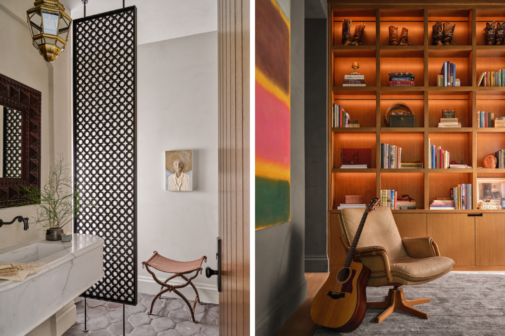 Though the residence beautifully captures a Spanish sentiment, Sander employed smaller details to give “a giant nod” to the family’s Texas roots. (After all, everything’s bigger in Texas.) Local artists like Jon Flaming cover the walls, while the husband’s collection of monogrammed cowboy boots is proudly displayed on the bookshelf in his study. “It’s a huge part of his identity and personal style,” Sander explains. “Knowing that he’ll be able to actually appreciate them from now on is really special.”
