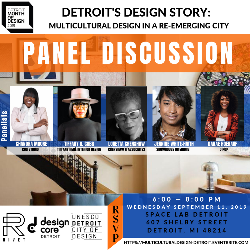 Rivet Design Collective, a membership-based multicultural design collective, co-founded by Tiffany Cobb of Tiffany René Interior Design and Clarinda Barnett-Harrison, is hosting a series of monthly events in Detroit to consistently gather diverse artists and creative influencers from under-represented backgrounds while curating intentional experiences for professional growth. The Detroit Month of Design event will highlight the design professionals of color who participated in the 2018 Junior League of Detroit Designers’ Show House, as well as design contributions throughout the City of Detroit by multicultural designers.