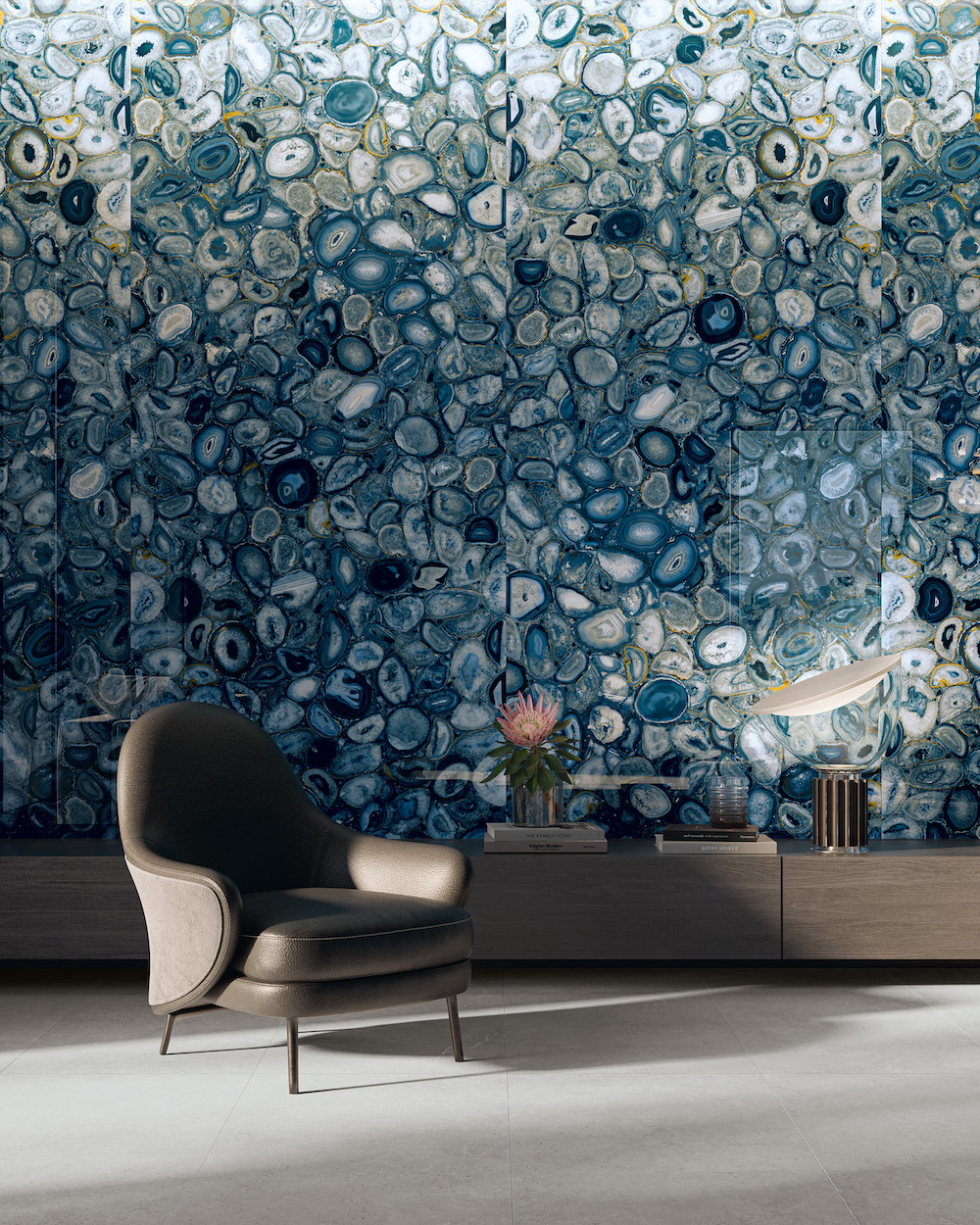 Agatina Blue, by EnergieKer, captures the natural allure of agate with a mosaic of inclusions ranging from deep blue to delicate white. The surface features precious details that give it unmatched realism. Coverings 2025 exhibit booth # 1708.