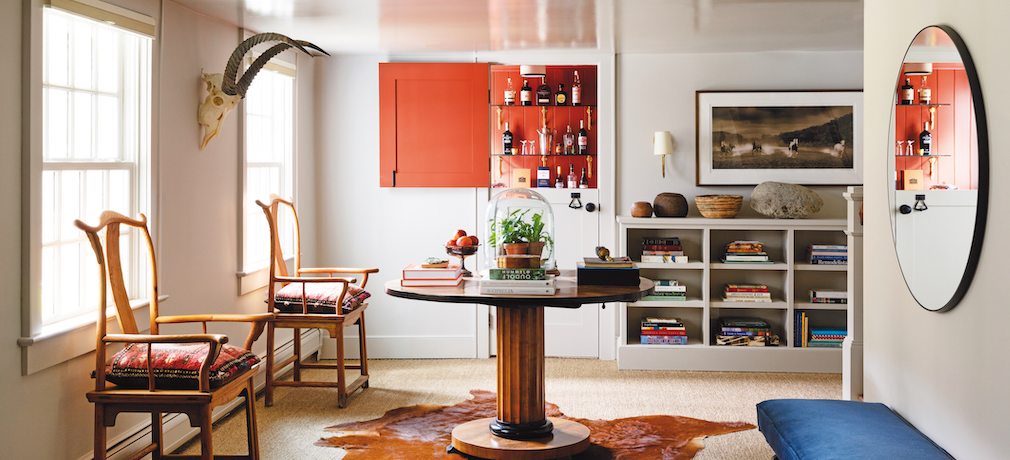 Taking full advantage of its wall of windows and leveled views of the river, an inspired Hendricks applied a glossy white lacquer to the low ceilings of the basement-turned-den, creating what she describes as a “glamorous” effect. “We knew the more reflective surfaces we brought in, the more we could bounce the light around the space.” The team maintained the continuity of using organic materials such as linen for the furnishings, and added a bold, orange-accented bar with a hideaway Dutch door and artwork by Bryan Nash Gill to elevate the sophistication of what has now become a preferred gathering and entertaining spot for the client.