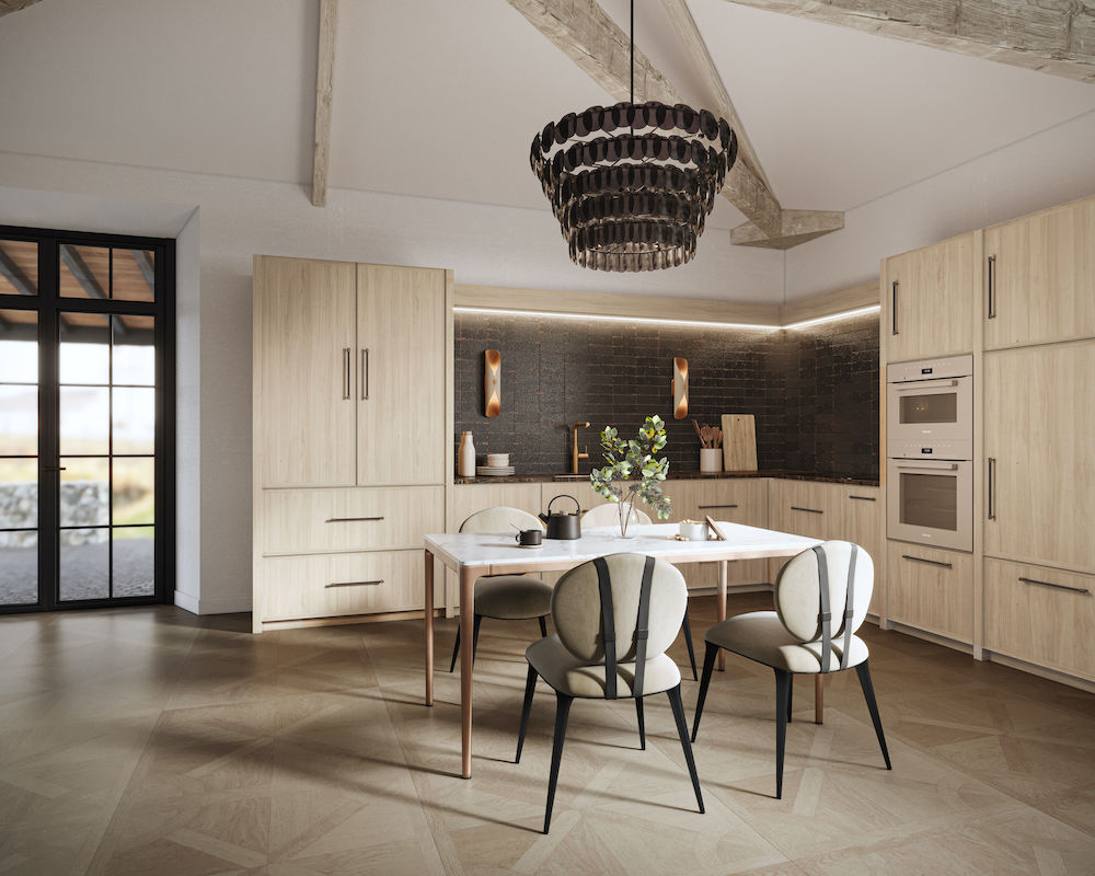 Cosentino is our engineered stone and compact porcelain surfaces partner, and I’ve selected their stunning Laurent, which is a Dekton product, for the countertop. It’s a black simulated stone look with these gorgeous copper veins running through it. On the walls behind that in the kitchen, I have my Metamor tile from Emser, which is this beautiful black tile with copper flecking and patina. The two of them together are perfect, just exquisite. Then the Kalco Uroko Pendant that hangs over the dining table in the great room in Extension House has these gorgeous brownish-black glass wafers with metallic trim that appear to float in the sky. Those three pieces together just tell such a beautiful story. To get to bring all of those together in one story, in one living world… for me, it’s very exciting.