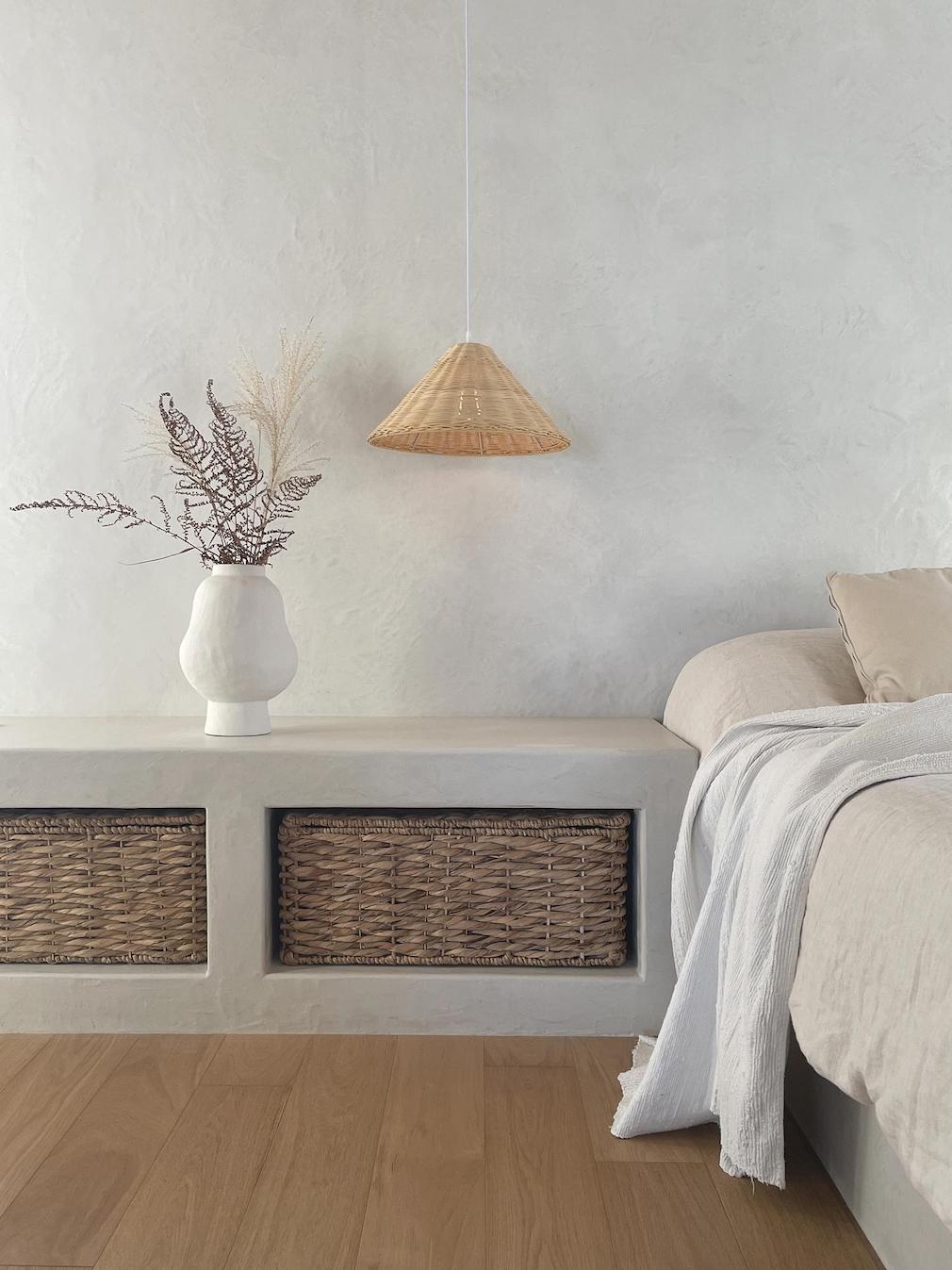 Here, the notion of connection — to oneself as well as to others — guided the project. Spaces were envisioned as an enveloping cocoon, conducive to rest, privacy, and moments of gathering. Walls, kept in light, neutral tones, were intended as a backdrop to highlight the filtered forest light, while the richness of the atmosphere relies on precise material work: wall finishes, cotton, linen, rattan, artisan tiles, and wood, omnipresent in the furniture and across most ceilings.