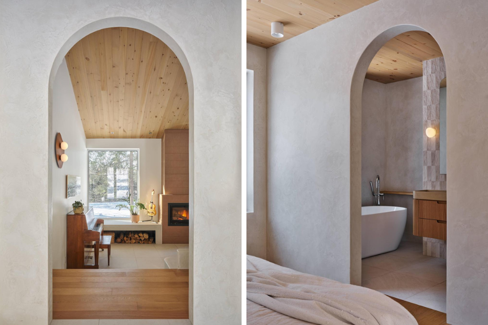The main entrance opens onto a spacious living area whose centerpiece is a built-in living room with integrated custom micro-cement furniture. Organized around a central fireplace and oriented toward the large openings facing the pond, this mineral ensemble gives the space a presence that is both sculptural and enveloping. Micro-cement, also used in the primary bedroom, evokes vernacular approaches more commonly associated with Mediterranean or Mexican interiors, still rare in Quebec’s residential landscape. This raw materiality contributes to the home’s timelessness and sensory dimension.
