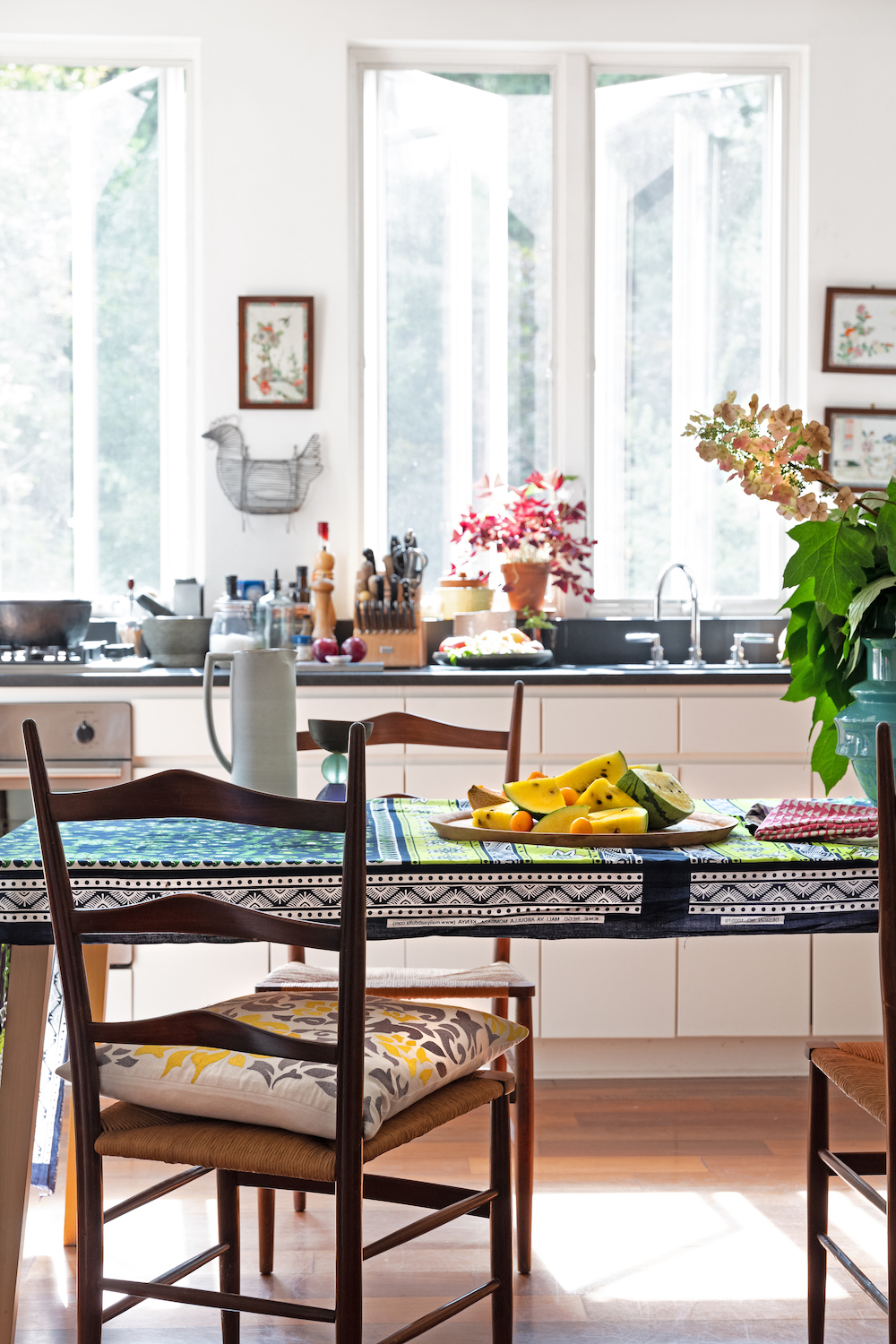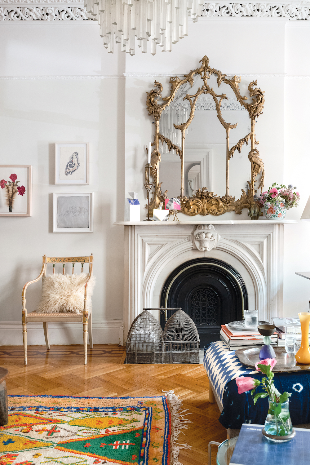 A Regency-style side chair is partnered with a barley twist pedestal table. A humble kitchen cabinet of the 1930s is right at home in a spruced-up bathroom. The dining room is set with a table by Ilse Crawford for De La Espada and classic Norman Cherner chairs. A gilt rococo mirror – from her mother’s house in London – hangs above the original marble mantel in the parlor, and vintage Moroccan rugs are found upstairs and down.