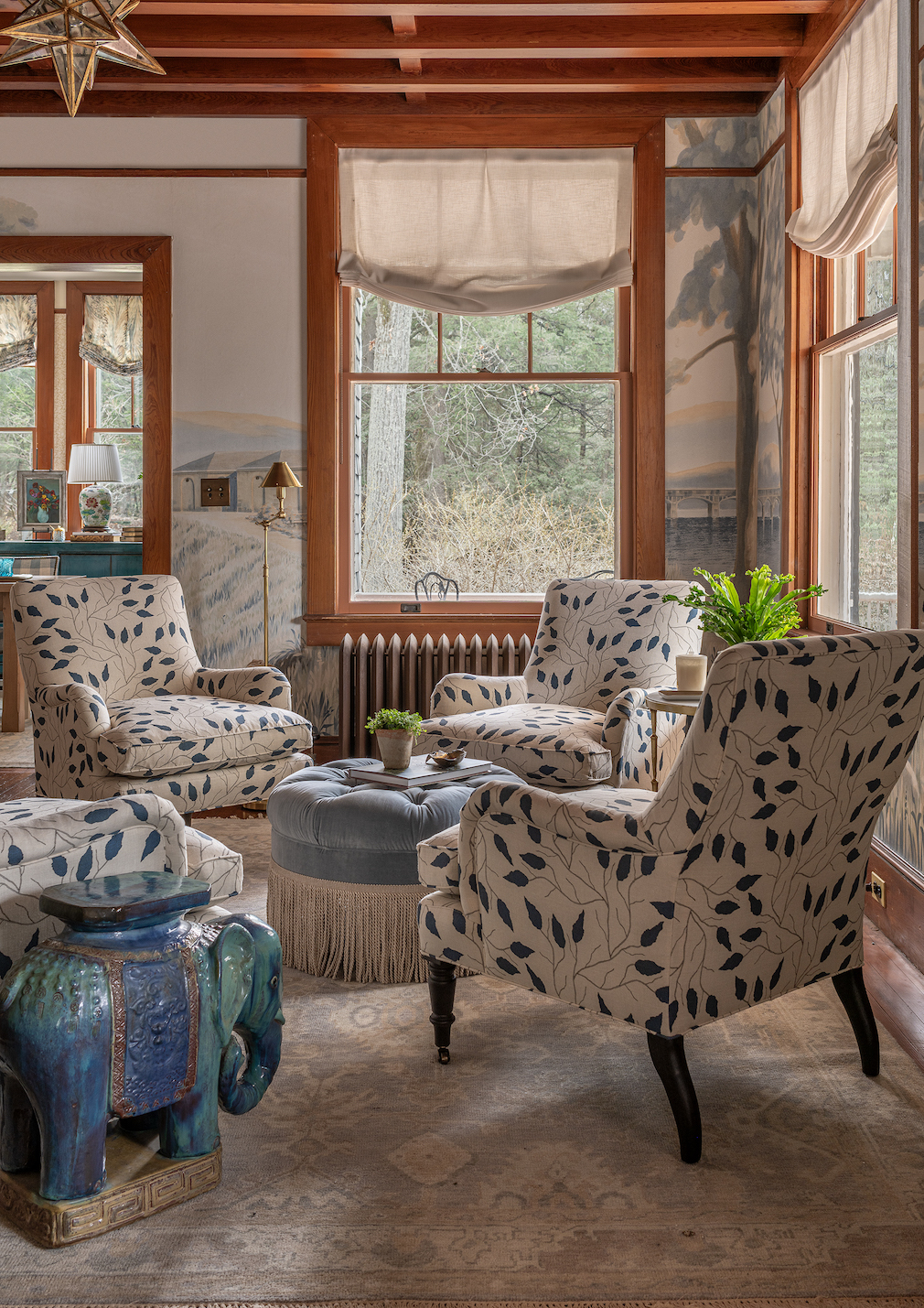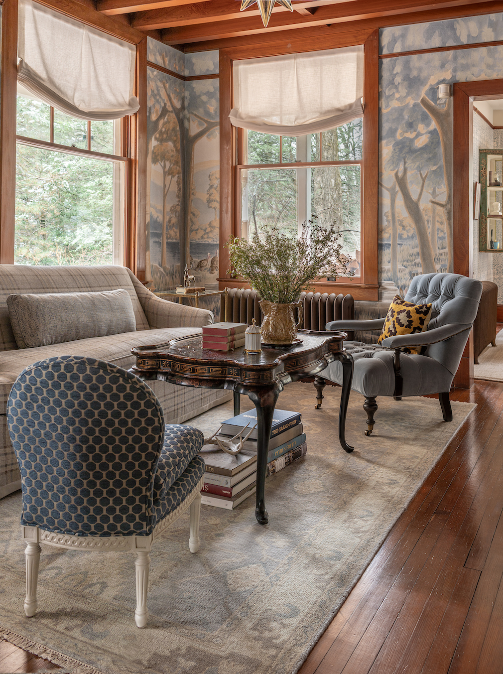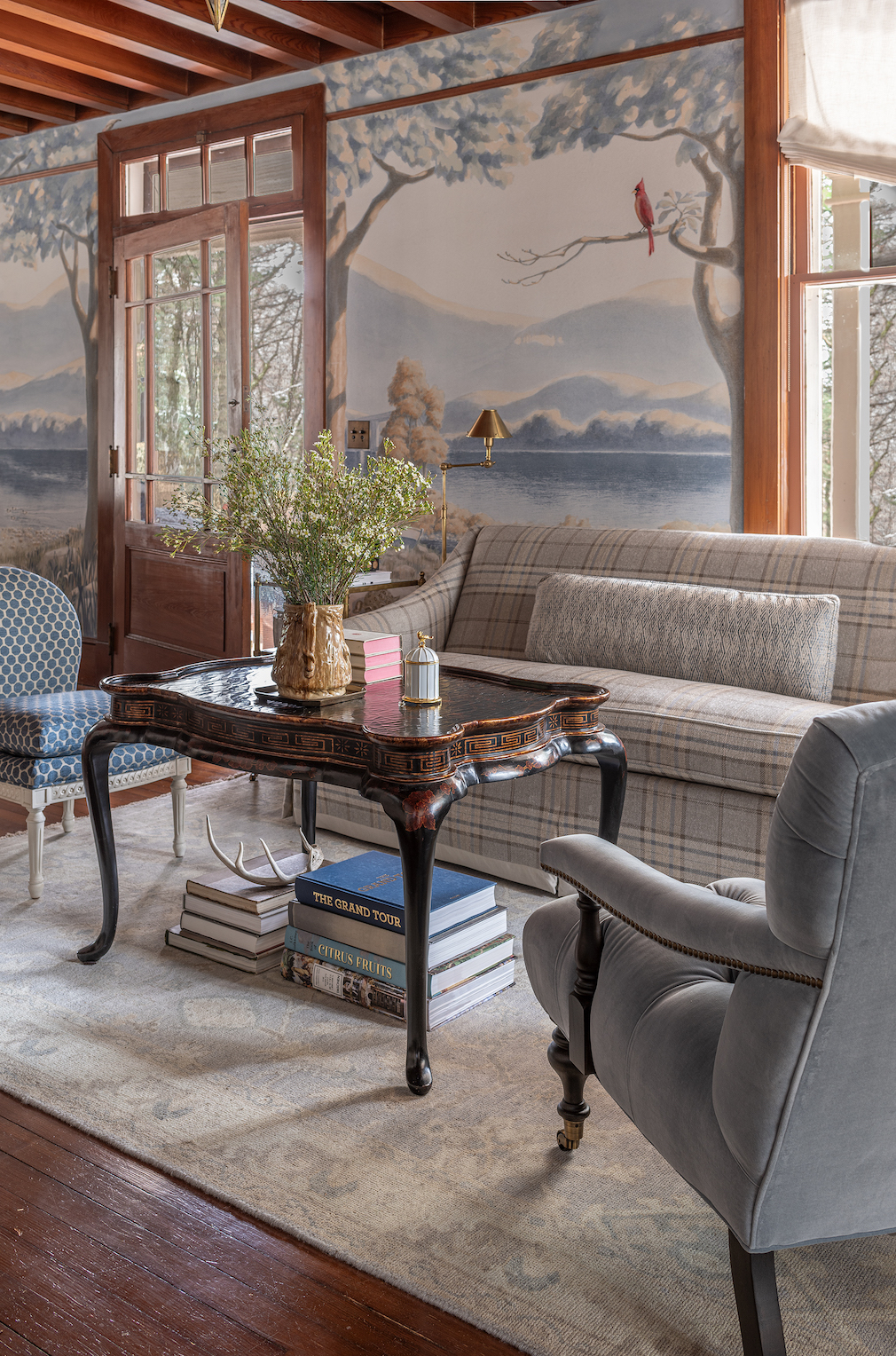 Interior designer Greg Feller at Hudson Home recently completed a project for a well-known author’s house on the Ashokan Reservoir near Woodstock, New York. A notable aspect of this design was the mural created by celebrated Rhinebeck, New York artist Richard W. Prouse. All four walls in the living room were swathed in a hand-painted mural depicting reservoir scenery, a tip of the hat to the original owner, one of the reservoir’s engineers.
