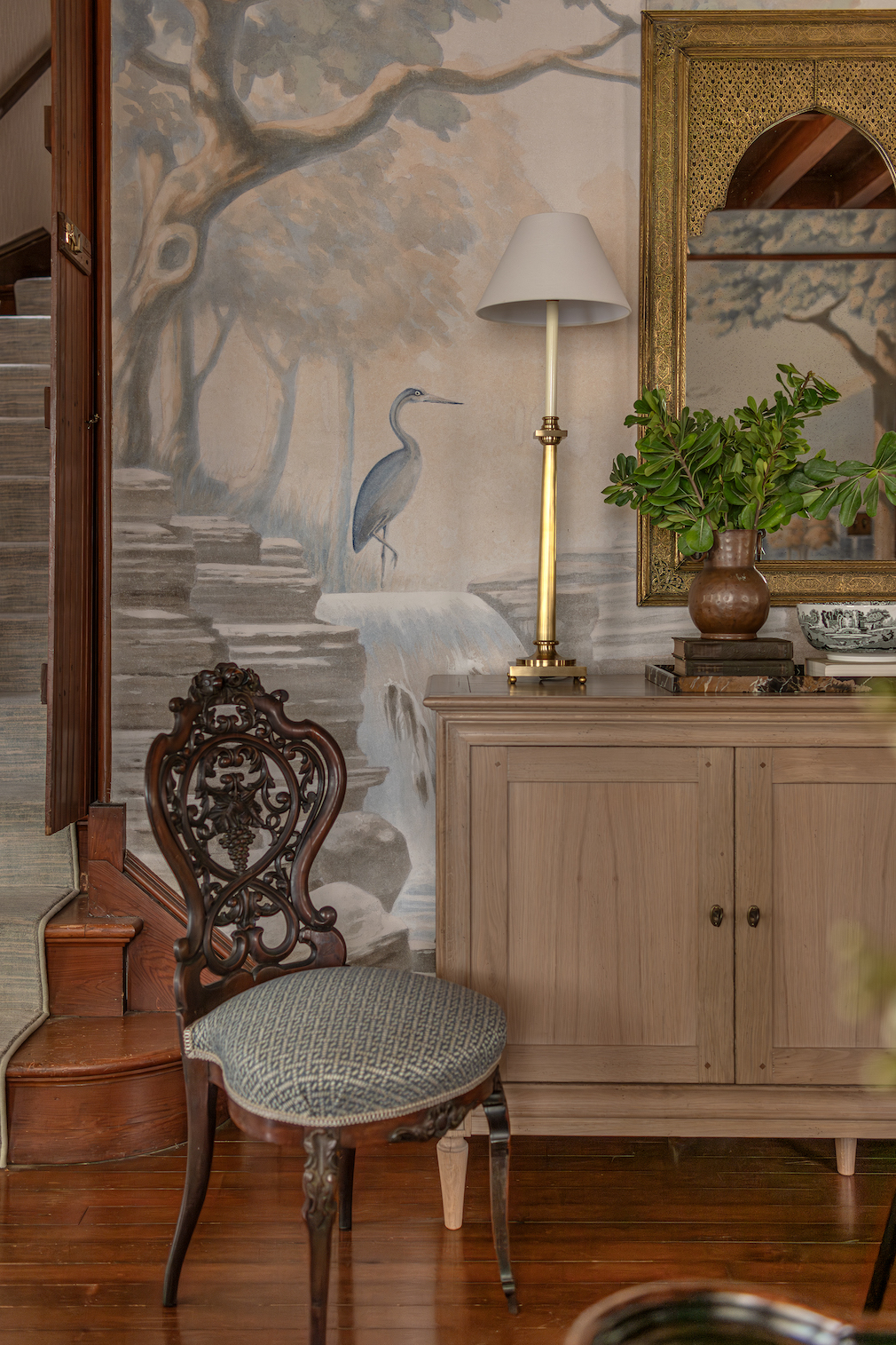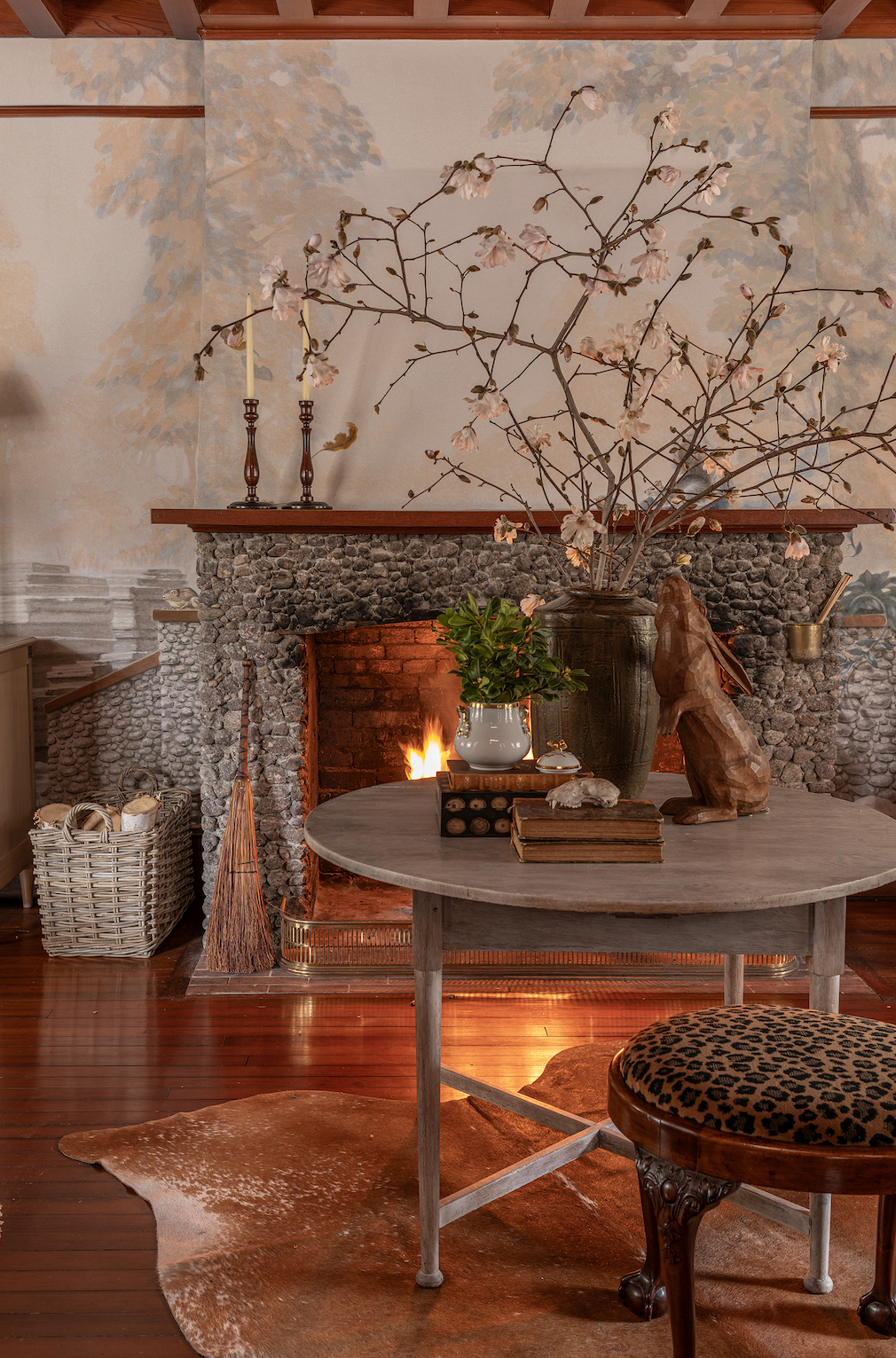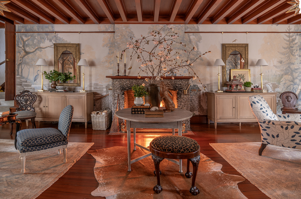 Interior designer Greg Feller at Hudson Home recently completed a project for a well-known author’s house on the Ashokan Reservoir near Woodstock, New York. A notable aspect of this design was the mural created by celebrated Rhinebeck, New York artist Richard W. Prouse. All four walls in the living room were swathed in a hand-painted mural depicting reservoir scenery, a tip of the hat to the original owner, one of the reservoir’s engineers.