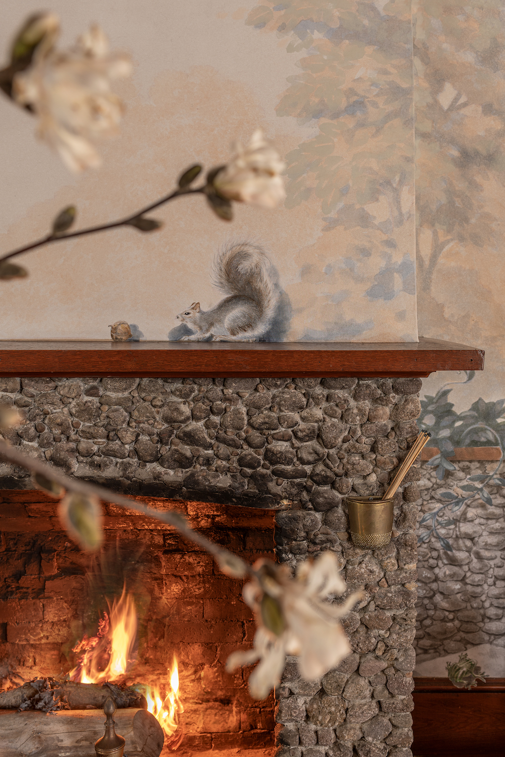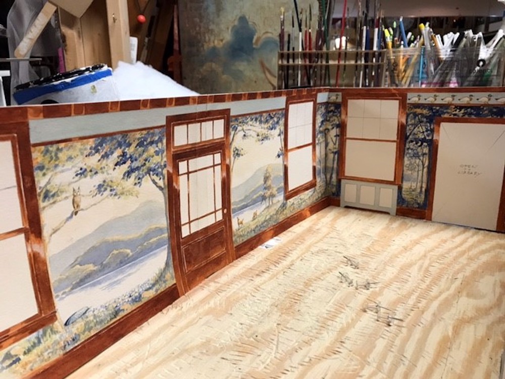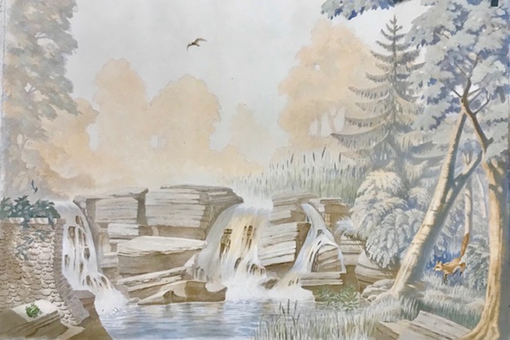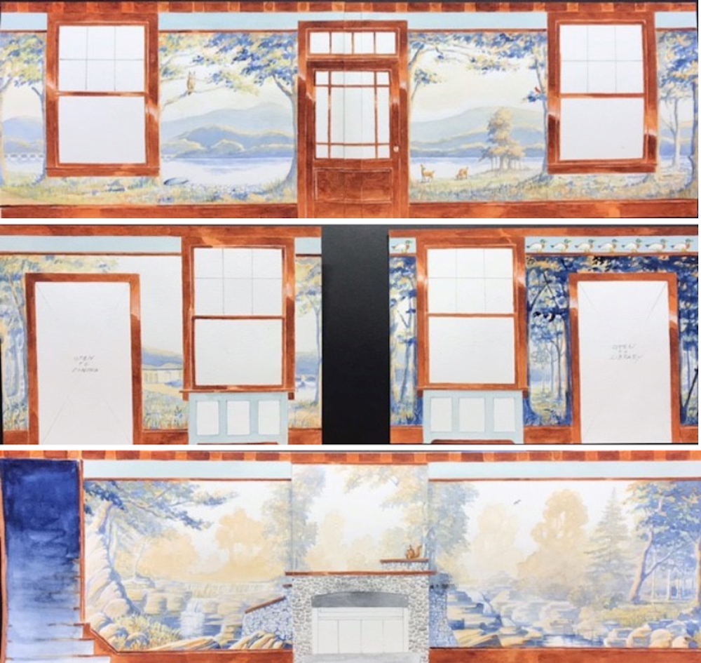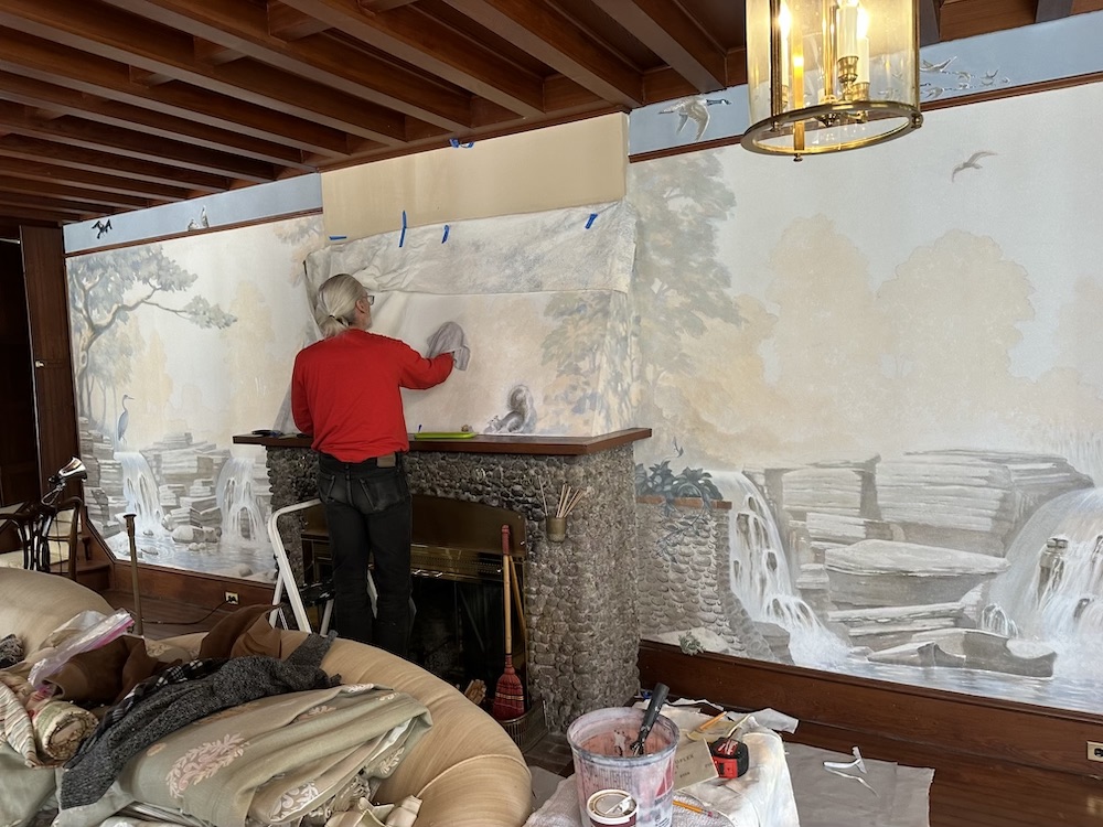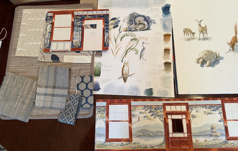 Richard Prouse: The client was looking for a nature scene that could reflect the Ashokan Reservoir, the home’s architecture and the terrain. We had a sit down with the client and discussed my vision, which she loved and had little to add. I then went to work on a scale model with a pile of fabric and wallpaper samples to direct my palette. After completing the full-color model, we sat down with the client who had a few changes, mostly regarding placement of the wildlife and saturation of the palette. Painting began in my studio on the first of January 2025, on muslin, with super-saturated acrylic scene paint and flat white indoor latex house paint primer. Painting was complete March 3rd and I began to “wallpaper” it on-site. This took three days, plus two days more to touch up and clear out.
