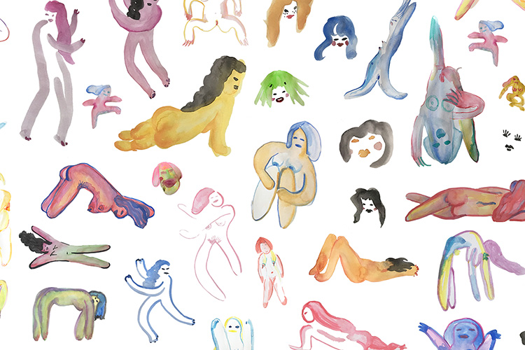 FEMPOWER COLLECTION LADIES’ WALLPAPER BY KATIE STOUT | Stout uses pastel watercolors to give life to her playful and free-spirited naked ladies. This confident team of bendable babes celebrates being a woman with charm and lightheartedness.