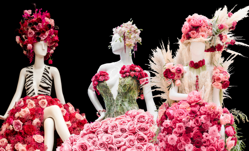 Rose Box, which is known for its preserved flowers, showed expanded talent with this installation where they also used a variety of fresh flowers. “We wanted to go out of our comfort zone,” admits designer Ann Castaldi. At their studio, they even named this mannequin “Olivia.” “We would talk to her like a real person and think of what she would want to wear,” adds designer and co-founder Dana Dadush.