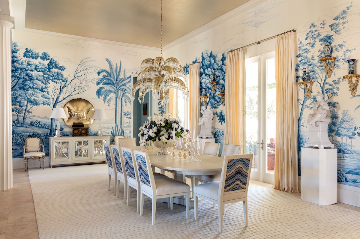 It was the de Gournay scenic wallcovering that served as Tristan Harstan & Company’s inspiration for this dining room. Blues are so part of de Gournay repetoire. In this room, the play of light on gleaming surfaces and the use of a hand-painted silk wallcovering create the sense of a more intimate and elegant dining space. Here, a wallcovering with historical references has been transformed into one that is fresh and modern in its monochromatic, bold, and refreshing palette of blues and white which plays off the flame stitch pattern of the Scalamandre fabric on the dining chair backs. The jungle canopy reaches to the ceiling to play up the volume of space below, countered by the shimmer of Thibaut’s modern tea leaf silver wallpaper above which I have framed by a simple and modern glossy molding detail. The reflective quality and exuberant style of the silver gilt and crystal Paul Ferrante Palm Chandelier draws your eye from the entrance to the center of the dining room. This is a room for the traditionalists among us.