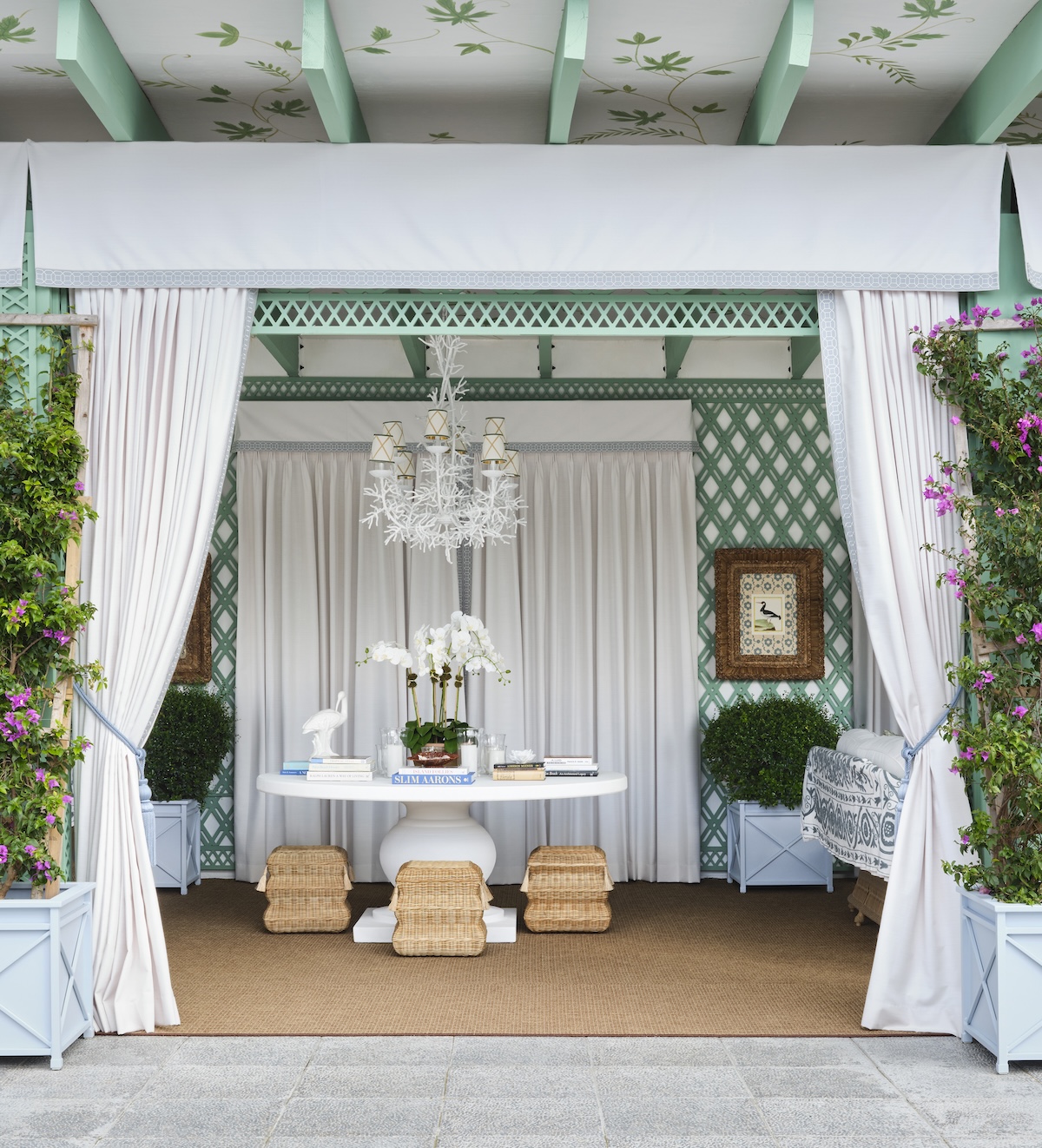 We also liked how Ariel Okin included botanicals to this Trellis Garden. Environmental Design Group provided color with textured boxwoods, fuchsia bougainvillea, terracotta pots and more, to add natural beauty to the space in quintessential Palm Beach style. Schuyler Samperton textiles add an anchoring color palette of blues and greens in a variety of patterns ranging from chintz to palms.