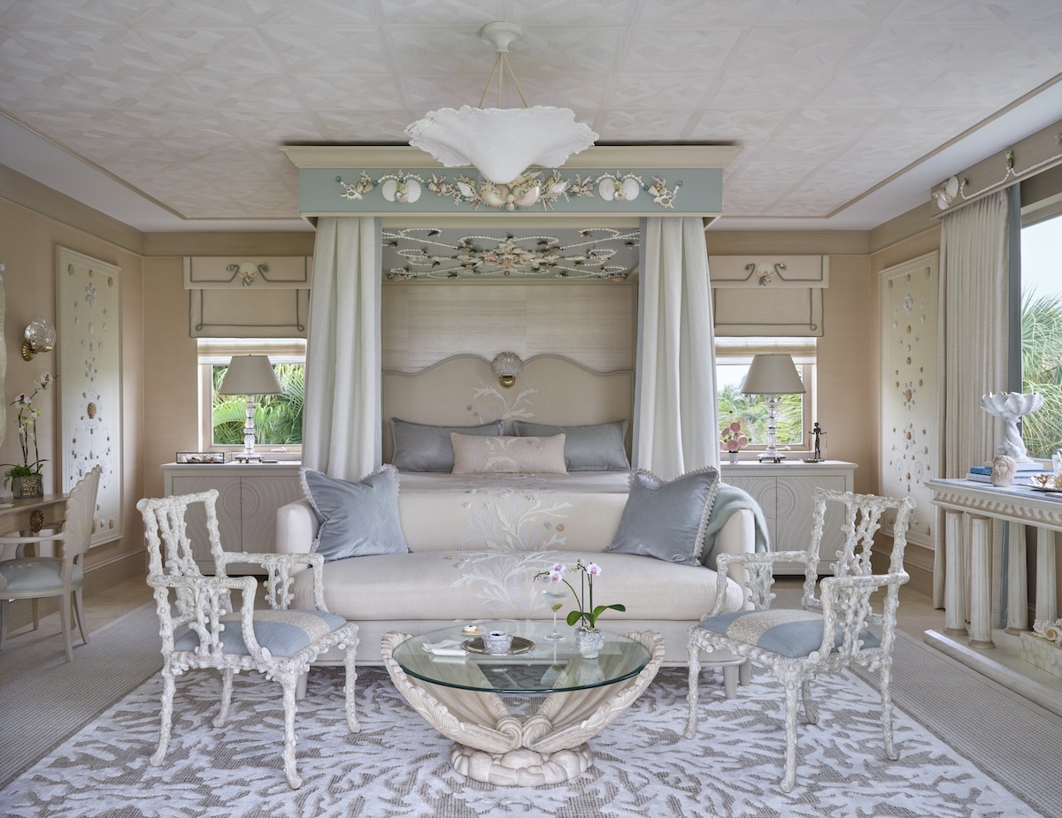 This bedroom sanctuary by Rinfret Limited evokes the natural beauty of seashells, creating a peaceful and serene space with a historic grandeur inspired by Vizcaya. It’s a name that conveys tranquility and elegance. They say they envisioned a room that was perhaps lost to time behind a hidden grotto, mysteriously found. It feels like stepping inside your own shell and finding the pearl. What a nice idea to have the bed’s ceiling dotted with shells as well as some walls. And the silks and neutral shades do ooze calm.