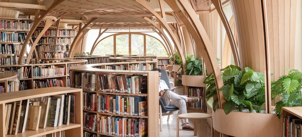 Around the central trees are freestanding bookshelves in circular hedge-like arrangements. Bibliophiles browse within the hedges, before heading to the lounge chairs and sofa benches by the windows for longer reads.