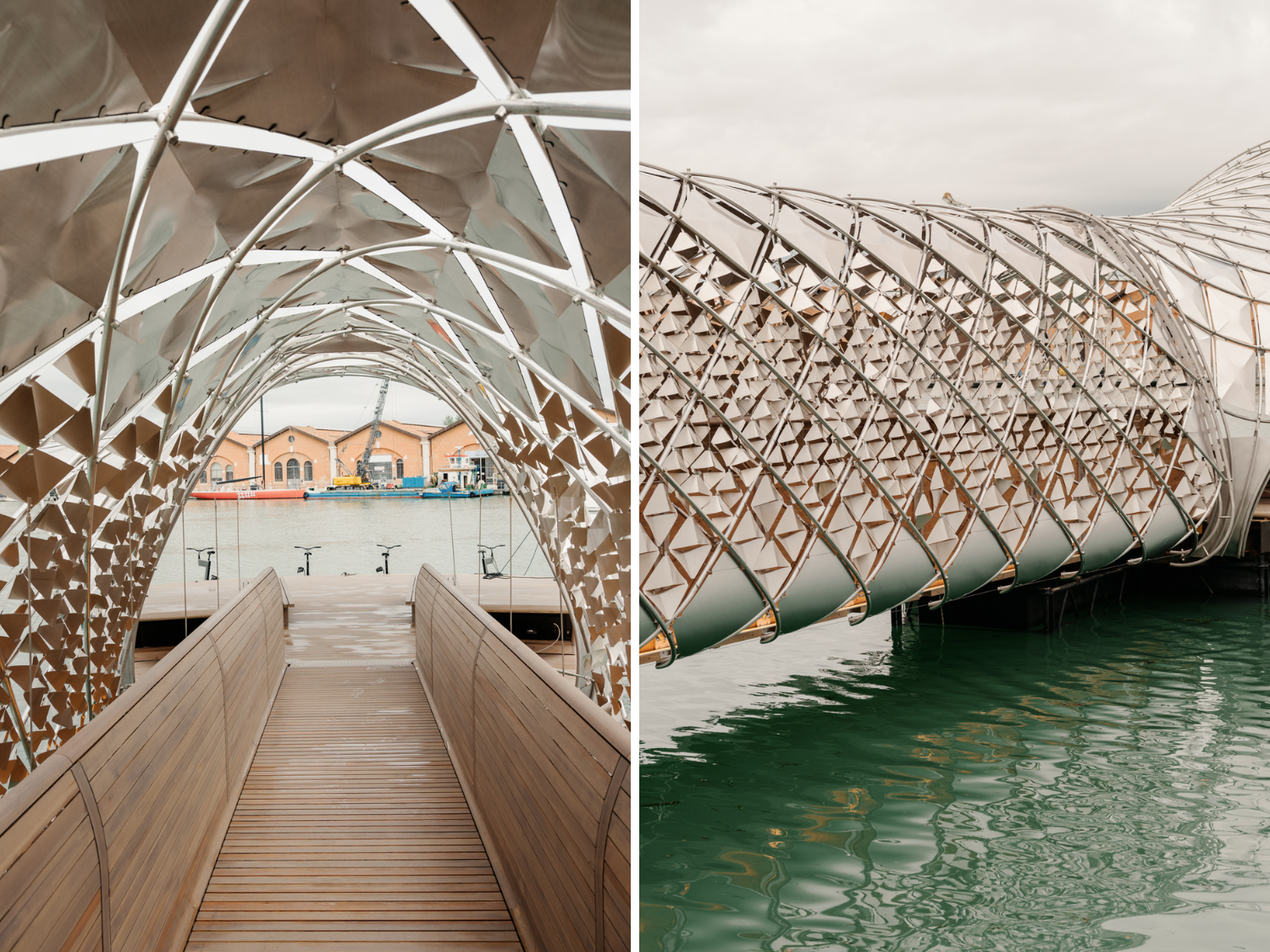 Gateway to Venice’s Waterway — a 121-foot-long, animal-like structure, evocative of Venice’s historic network of bridges — is a physical manifestation of the intersection between design and architecture. The design and construction of the outer structure are derived from lightweight technology found in racing cars such as the Porsche 917, which combines a solid aluminum structure (chassis) with a kinetic surface inspired by Porsche’s Kubus pattern. Both a functional gateway and bridge, the hub actively connects with new electric modes of transportation both on water and land.