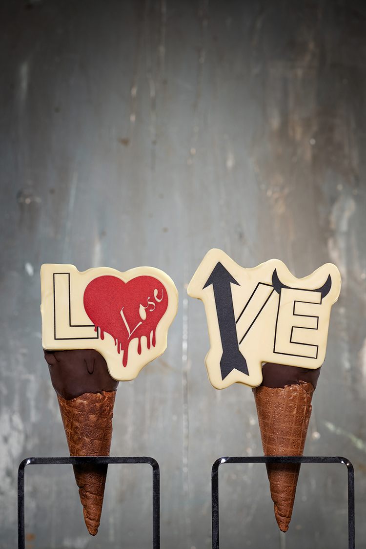 GIAPO Valentine’s LOVE Creation | Valentine’s Day is surely one of the most divided holidays we’ve got: you either love it or you hate it. But whether your in love, a cynic or a downright hopeless romantic, we can all agree that love has taught us multiple lessons. Our Valentine’s Love creation is a reminder of this wild nature of love. Split between two cones with a white chocolate topping, it reads the word “LOVE” with the words “Lose” etched subtly into the heart. That’s no buzzkill, but rather a reference to Amy Winehouse’s song Love is a Losing Game. It’s Giapo’s way of reminding us of the raw truth about love, that love is an imperfect but beautiful journey of sacrifice and understanding.