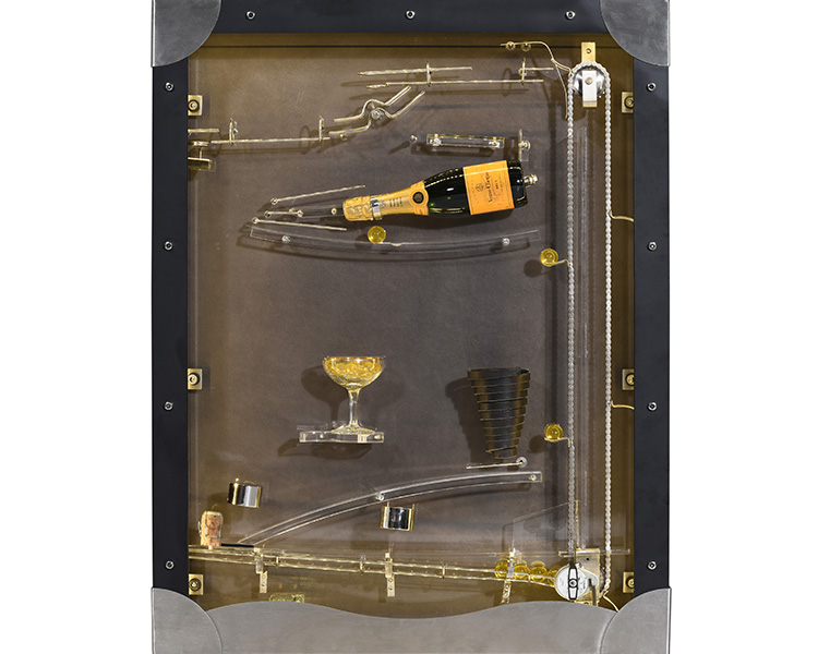 This unique piece of live art from Timothy Oulton features colored marbles charged with kinetic energy, moving in a carefully choreographed dance around a champagne bottle.