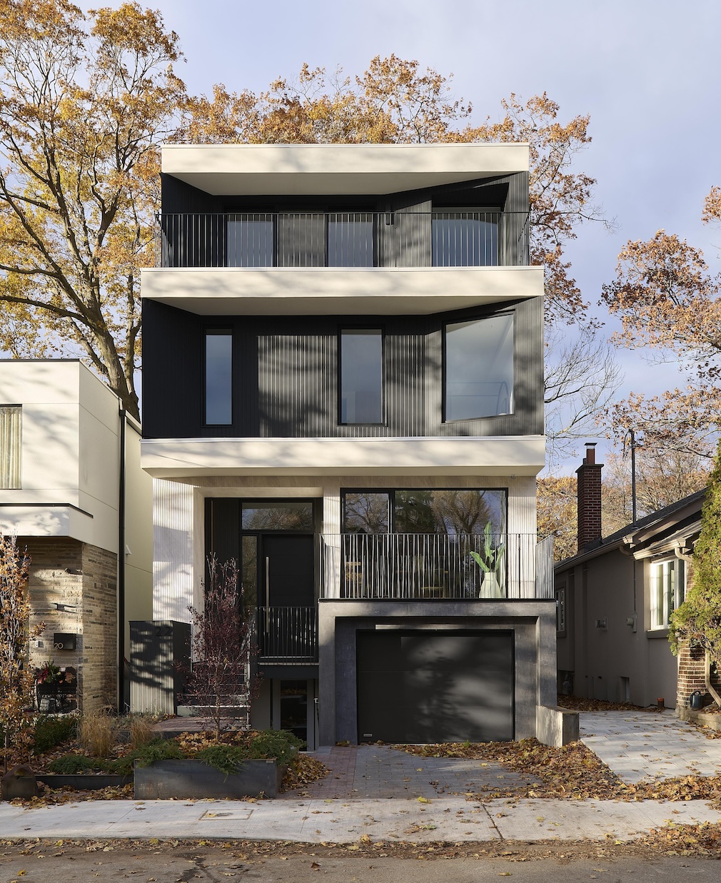 Set on a quiet cul-de-sac within a mix of older homes and newer modern builds, the house sits with poise rather than dominance. Angled planes, recessed balconies and a wrapped façade temper the volume, while keeping the architecture unmistakably modern. Fine stucco, black-stained cedar and composite stone form a disciplined exterior palette that is carried indoors through oak flooring, brick tile and muted millwork.