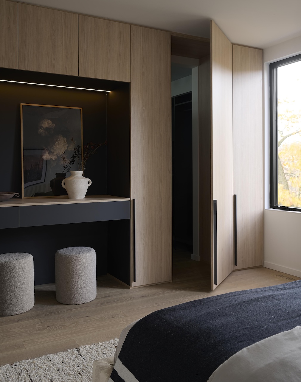 The second run of oak waterfall stairs with a two-tone guard leads to the principal suite’s sitting room, where a glass wall opens to the roof deck and the tree canopy beyond. A deep burgundy bar anchors the room, balancing the expansive outdoor views that stretch over the tree canopy to Lake Ontario in the distance. The principal bedroom uses windows on two sides to frame the surrounding treetops. A full wall of built-ins in quarter-cut oak and matte graphite includes a wardrobe, a vanity and a concealed door to a flexible room – ideal for a hidden office or extended wardrobe.