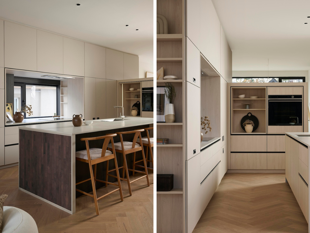 Traveling up two steps into the center of the home, the space is defined on one side by the stairwell, and on the other by the kitchen with its generous island finished in Caesarstone concrete. Light grey and whitewashed oak cabinetry with black detailing give the kitchen a warm, quiet presence, while the island’s red-toned brick end gables introduce a subtle richness.