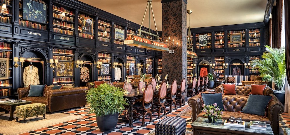 Upon entering Graduate Princeton’s Gothic-inspired lobby, guests are greeted by a hand-carved wooden reception desk flanked by four wooden statues of the school’s beloved mascot, the Tiger. Floor tiles rendered in Princeton’s signature orange and black anchor the two-story library-like lobby, lined with thousands of books and a collection of colorfully embroidered vintage Reunions Jackets — a token received by alumni at their 25th Reunion. A 30-foot carved wooden study table, a staple in every Graduate, is reminiscent of the historic libraries on campus and serves as a place for visitors and students to study, gather, and connect. The names of Princeton’s storied eating clubs are painted in gold leaf on the library bookcases that frame the space.