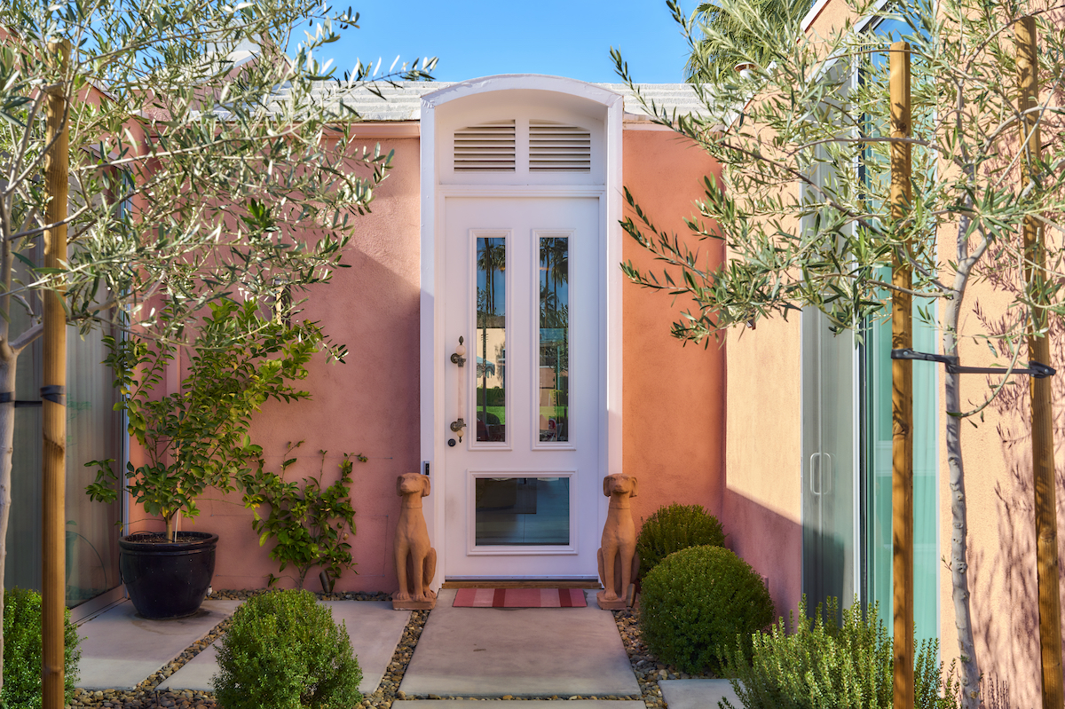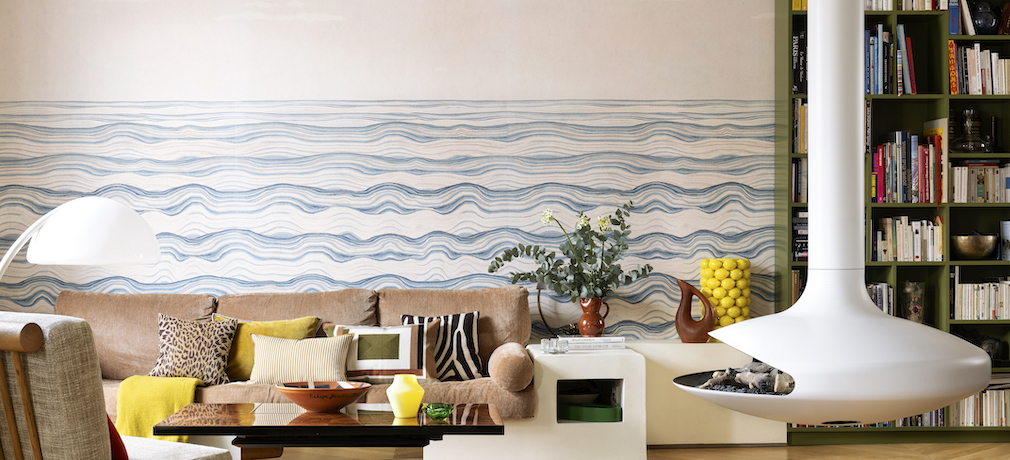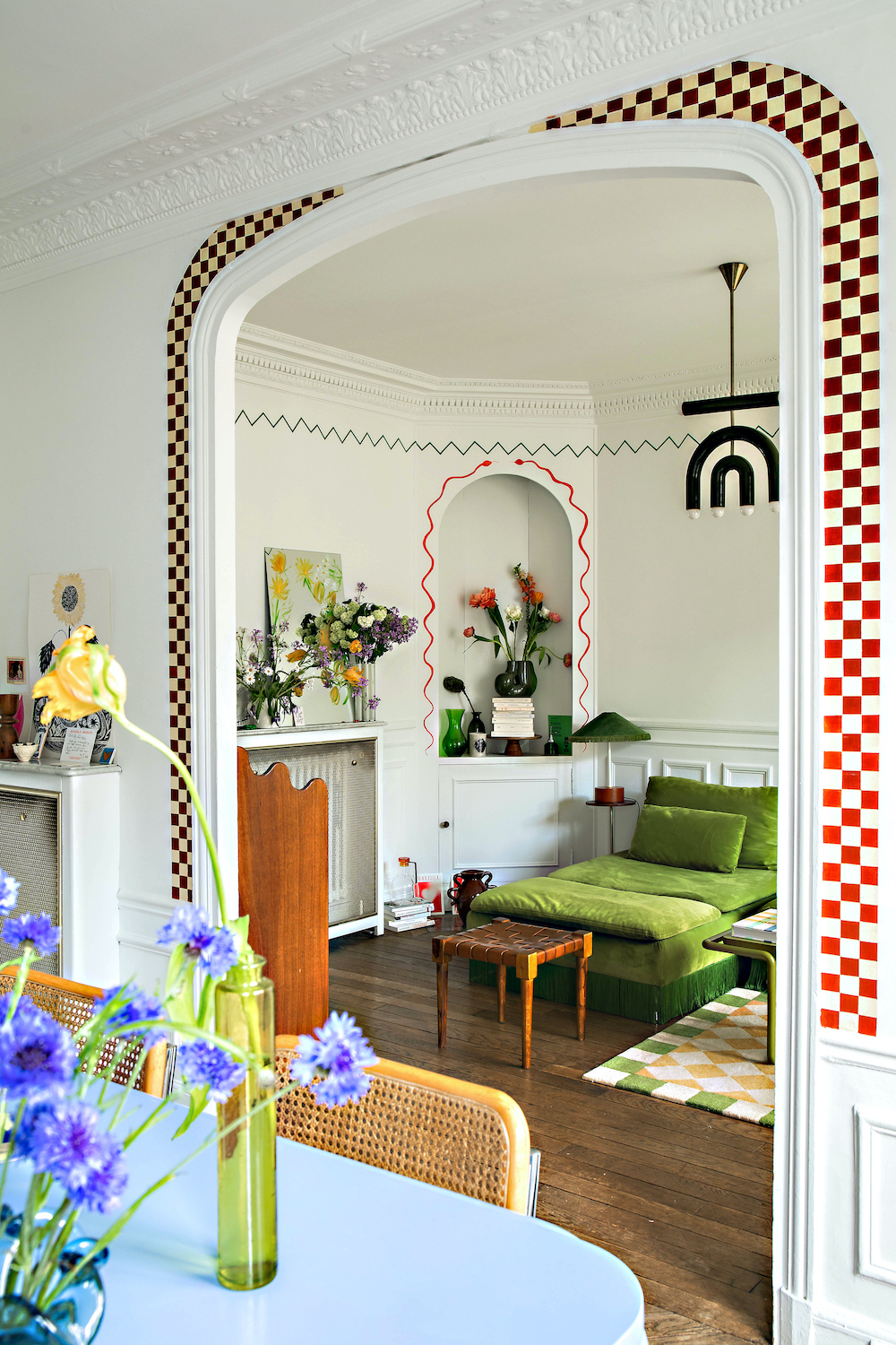 While certain pieces really pop, such as a rug they designed that comprises a pale center bordered by circular cut discs of blue, overall, this home expresses a laid-back nonchalance. There’s art in the central hallway, but rather than the ubiquitous gallery wall, just a few pieces are hung there. A humble Ikea sofa upholstered in green velvet with a contrasting fringe is an almost bohemian touch. Even the painted zig-zag that runs around the living room – along with two serpentine squiggles that frame an arched niche – read as something a child might have had fun doing, rather than a designer’s flourish.