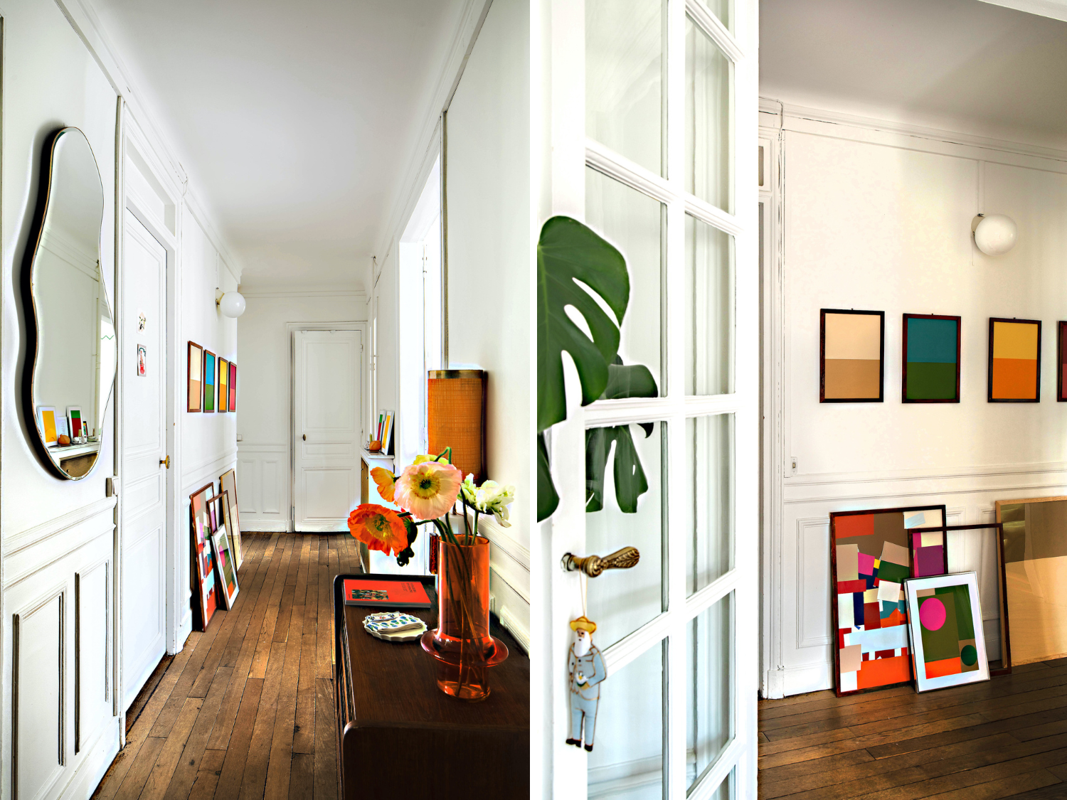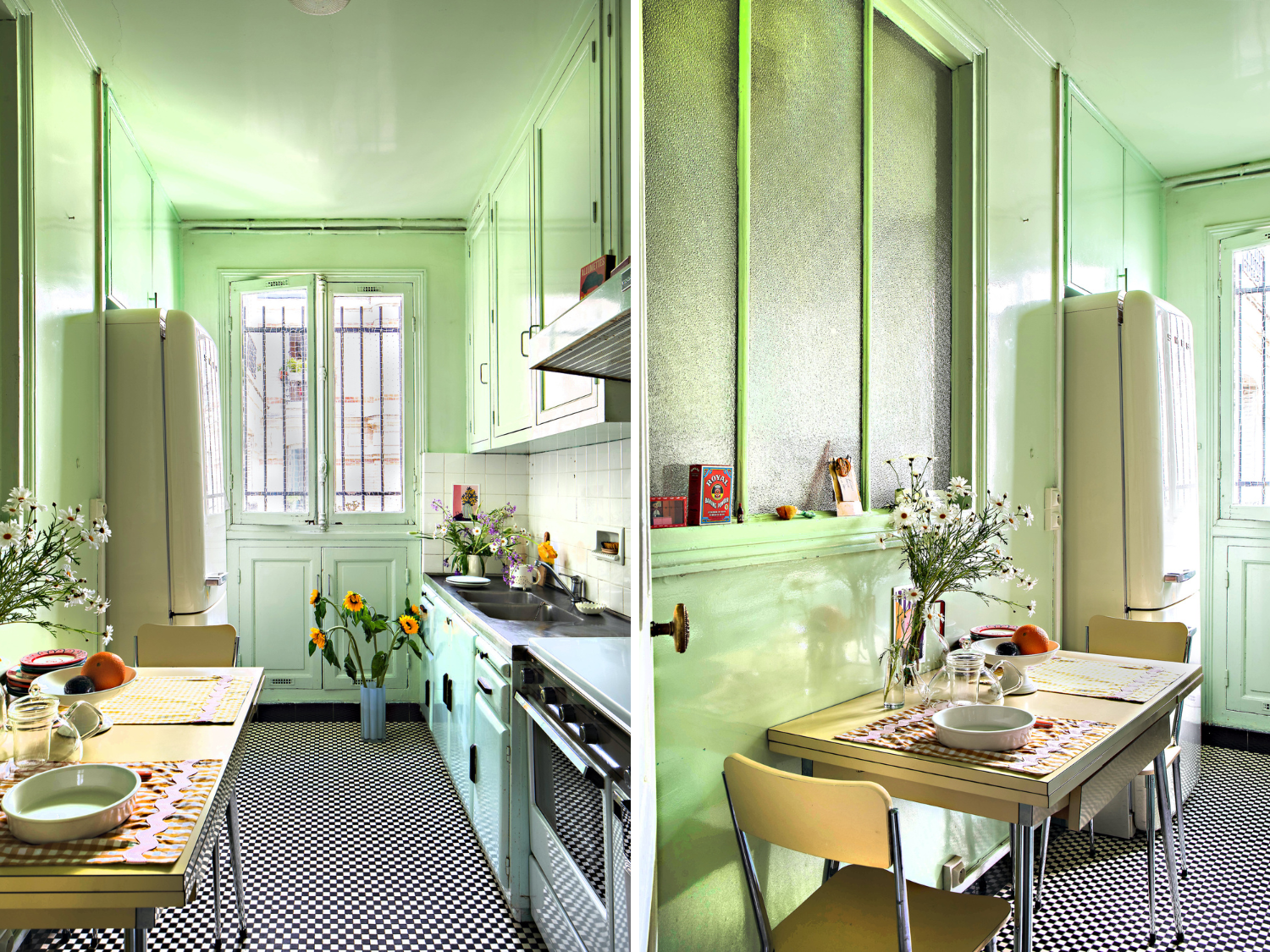 The first time Gras and Seguin viewed the apartment, the space, with its abundant natural light and a sea-green kitchen, put them in mind of Claude Monet’s garden home at Giverny, which they had recently visited. Inspired by the artist’s bucolic residence, as well as by the palette of American artist Joan Mitchell and the compositions of Josef and Anni Albers, the couple embraced the architectural essence of the apartment while imbuing it with a highly personal liveliness.