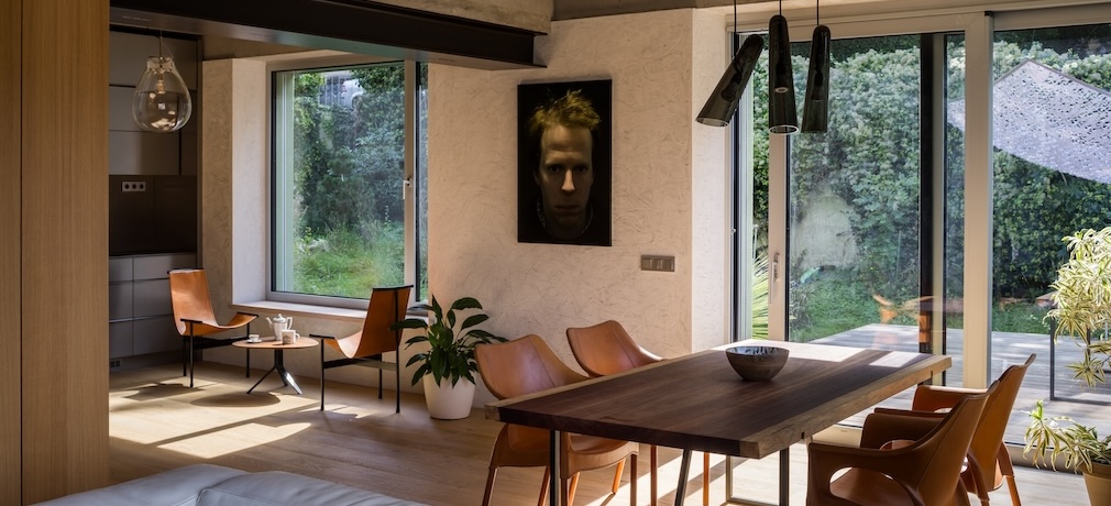 In the summer months, it is possible to extend the living space to the outside and connect it seamlessly with the garden. The living space is serviced by a green bathroom and houses a small utility room.